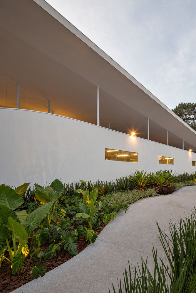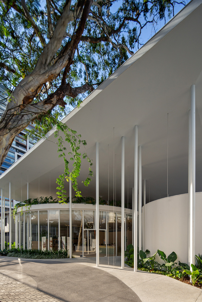 Расположение в преимущественно жилом районе и низкая горизонтальная композиция помогают павильону уважительно вписаться в окружающую среду.