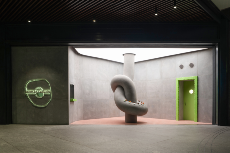 Общий вид пространства с инсталляцией и входом Donut of Curiosity store