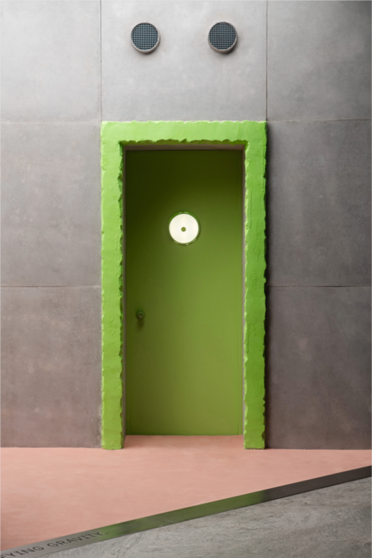 Зеленая дверь в бетонной стене с подсветкой Donut of Curiosity store