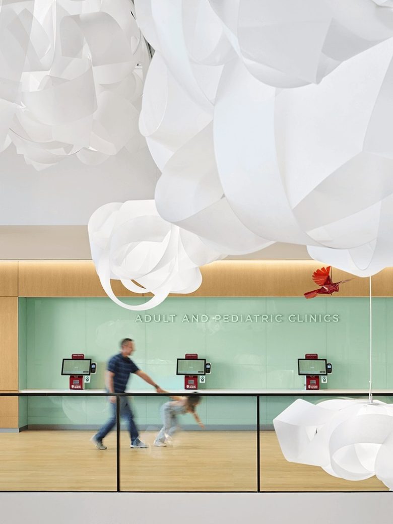 Зона регистратуры с художественной световой инсталляцией UChicago Medicine Crown Point