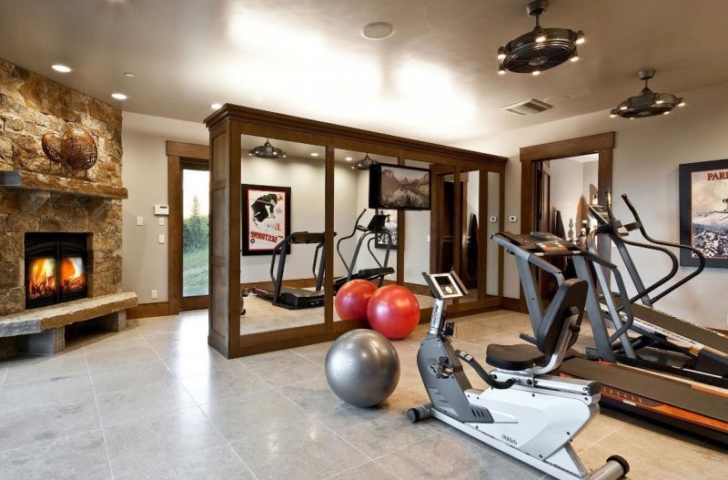 Собственный спортивный зал – мечта любого сторонника здорового образа жизни. Обустроить комфортный уголок для поддержания отменной физической формы можно и в домашних условиях. Грамотно продуманный дизайн спортзала позволяет оформить комнату не только красиво, но и эргономично и безопасно. Выбор помещения Для полноценных занятий спортом, комфортабельного расположения тренажеров и удобного хранения спортивного инвентаря необходима достаточно обширная площадь. Минимальный размер комнаты для проведения гимнастических упражнений должен составлять не менее 8 квадратных метров. Идеальный вариант размещения частного спортзала — отдельное помещение площадью более 10 квадратных метров с хорошей вентиляцией и наличием больших окон. Достаточный приток воздуха – залог хорошего самочувствия во время кардиотренировок. Высокий уровень естественного освещения необходим для повышения работоспособности, улучшения настроения и предупреждения возникновения травмоопасных ситуаций. Наиболее соответствующими этим требованиям помещениями в доме являются мансарда и застекленная веранда. Мансардные потолки очень часто оснащены балками, на которых удобно подвешивать снаряды, например, боксерскую грушу. Так же на чердаке есть окна, которые послужат источником света и воздухообмена. При оборудовании мансарды в качестве спортзала необходимо позаботиться о кондиционере. Из-за нагрева крыши эта часть дома обычно отличается повышенной температурой воздуха. Веранда частного дома так же прекрасно подходит для тренировок. Обилие света, постоянный приток воздуха и чудесный панорамный вид на сад и домовую территорию сделают занятия спортом комфортными и продуктивными. Для домашнего спорткомплекса так же можно использовать подвал или цокольный этаж. Но при планировке этих помещений стоит уделить особое внимание освещению и системе вентиляции. Основные правила разработки дизайна домашнего спортклуба При оформлении помещения под тренажерный зал может воплощаться любое дизайнерское решение. Но при планировке комнаты важно соблюдать основные требования, которые выдвигаются не только к домашнему, но и общественному или школьному спортивному комплексу: Расположение оборудования и снарядов должно быть максимально продуманным. Это важно не только для комфорта тренирующихся, но и для их безопасности; Рационально используйте свободную площадь и размещайте инвентарь и тренажеры, используя все возможное пространство. Но не забывайте о минимально допустимом расстоянии между оборудованием. Это особенно важно в случаях, если в домашнем спортклубе будут одновременно заниматься несколько членов семьи; Интерьер помещения должен быть не только привлекательным. Разработанный дизайн и подобранная для него отделка должны способствовать поддержанию чистоты и удобному обслуживанию снарядов. Наиболее приемлемым для обустройства спортзала стилем является лофт. В этом течении приветствуются деревянные балки, удобные для крепления спортивного оборудования, и обилие функциональных металлических сооружений, которые так же можно использовать для тренажёрных снарядов. Зонирование спортзала Как и в общественном комплексе, в спортзале на дому принято делить помещение на определенные функциональные зоны. Не все из них являются обязательн