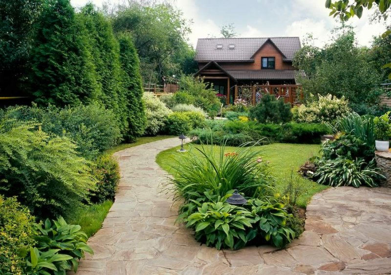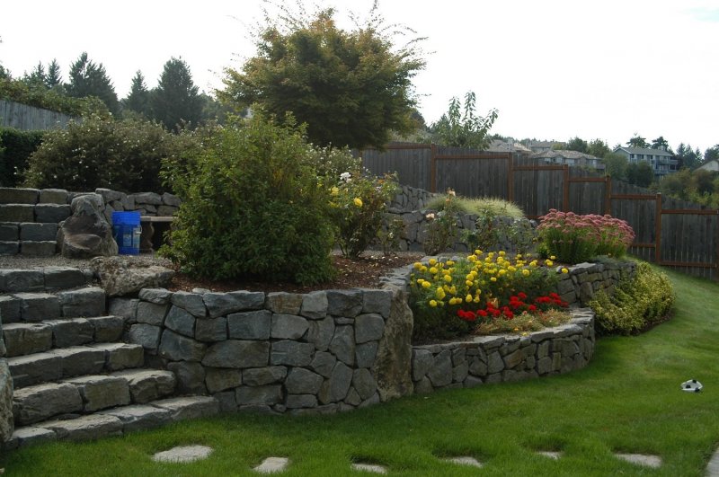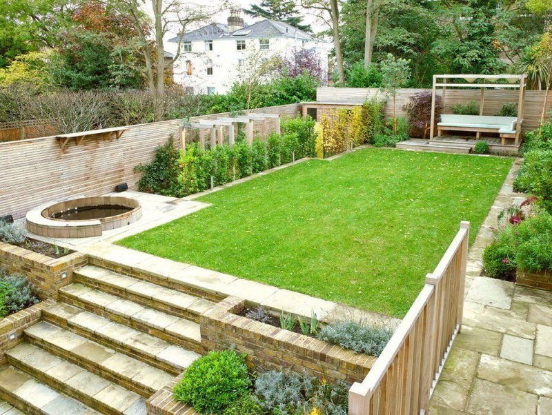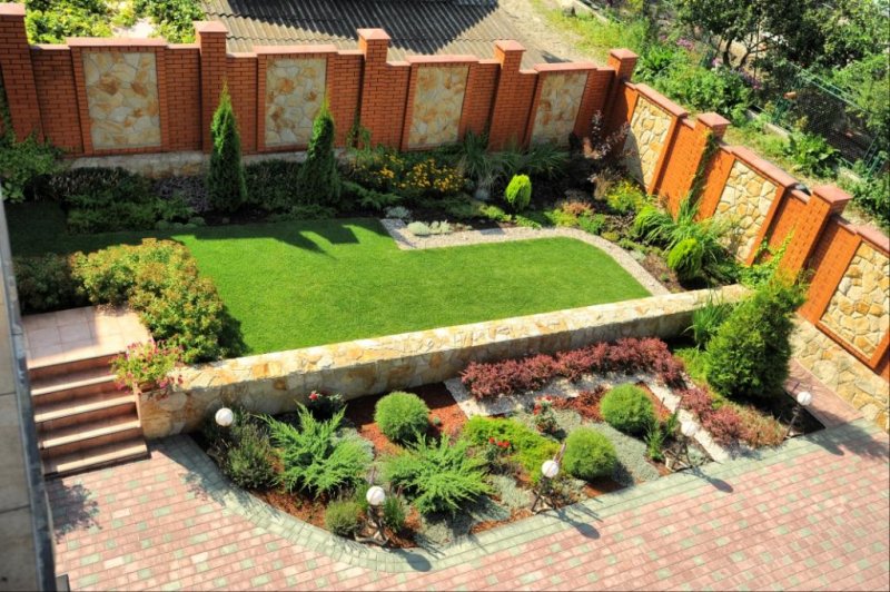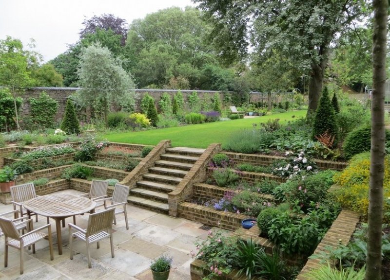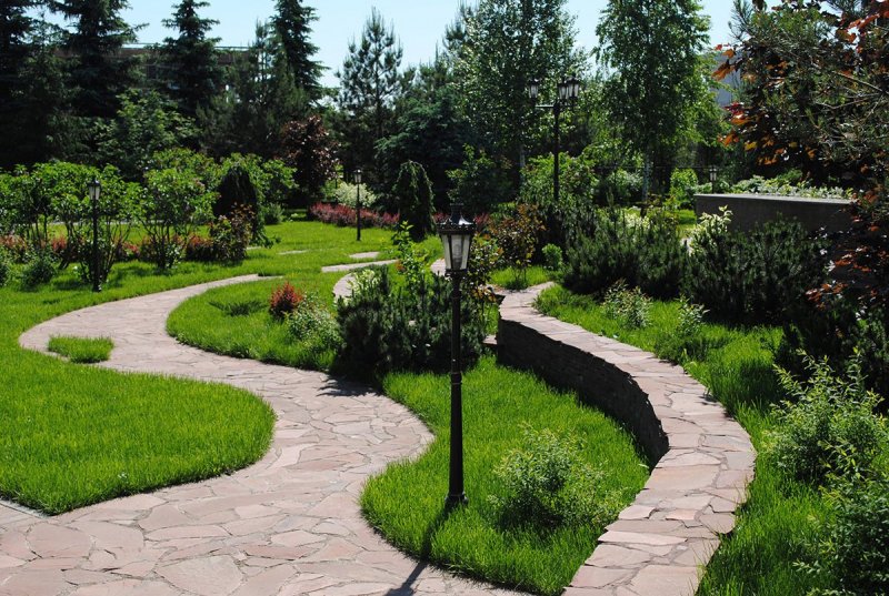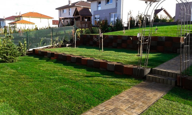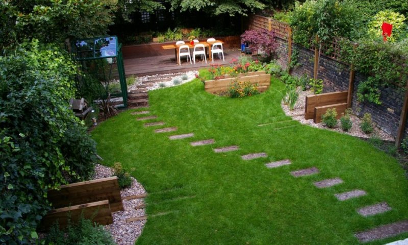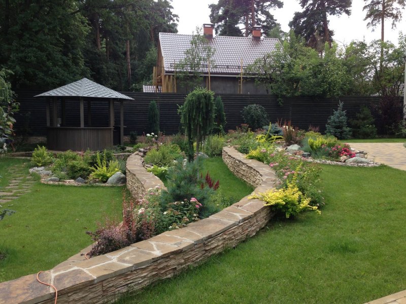 Надел с наклоном обычно стоит дешевле, но затраты на его обустройство нивелируют эту выгоду. Главный плюс такой территории заключается в интересном внешнем виде, большой вариативности дизайнерских решений. Участок засаживают большим количеством растений, практически повсеместно. Ими укрепляют склоны. Обязательно наличие наклоненных извилистых троп, а в большинстве случаев и лестниц. На дорожках с большим количеством изгибов крутизна подъема будет меньшей. Лестницы оборудуются перилами. Уклон маршей делается ниже 45°. Большие террасы позволят выиграть много пространства. Помимо этого, отпадет потребность в большом количестве высоких укрепительных стен. Для предотвращения сползания масс со склонов создаются специальные сооружения — геоматериал (это может быть георешетка или геотекстиль), габионы, подпорные стены, насыпи.