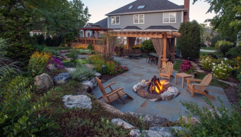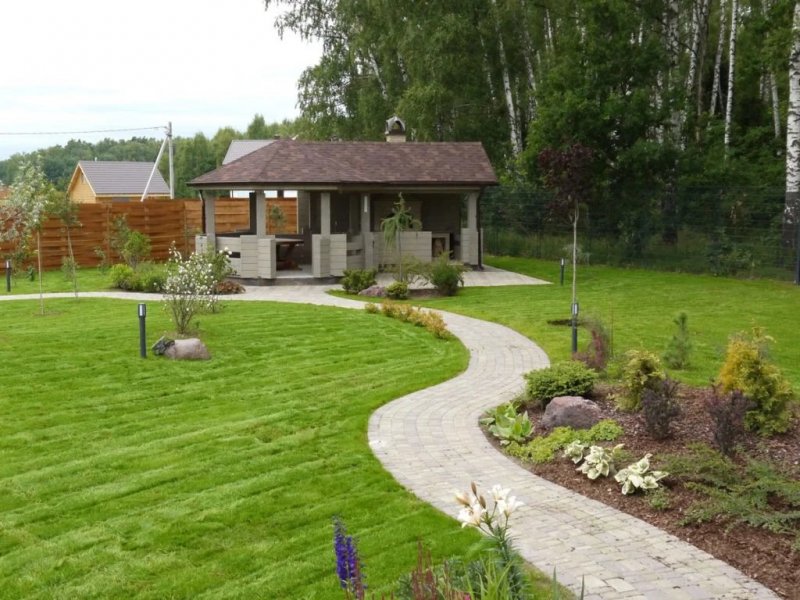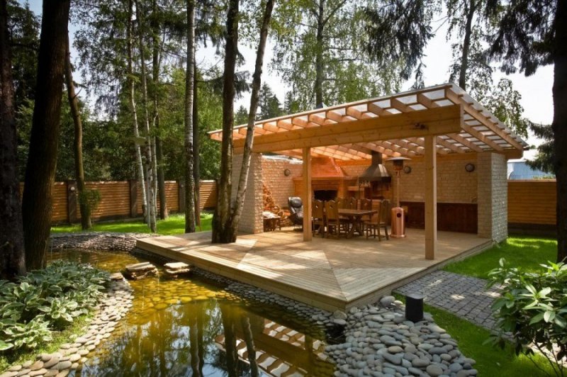 На крупных земельных участках есть возможность организовать большую зону для отдыха. В центре обычно ставят стол и широкие стулья, рядом устанавливают мангал. На больших участках не лишним будет бассейн. Кресла-качалки и диваны-качели позволят расслабиться и хорошо провести время. Это зона отдыха открытого типа. Блок закрытого типа может представлять широкую террасу, закрытую частично или полностью. Она может примыкать к основному зданию или стоять отдельно. Закрытой зоной считается и открытая территория под навесом. Геометрия загородного дома может создавать дворик (патио). В таком случае зона отдыха размещается там, и соответственно, входит в состав жилого блока. В последнее время стал модным универсальный вариант — зона, отделенная мобильными перегородками, каркасами и занавесками. Их можно убрать в течение нескольких минут и превратить закрытую территорию в открытую.