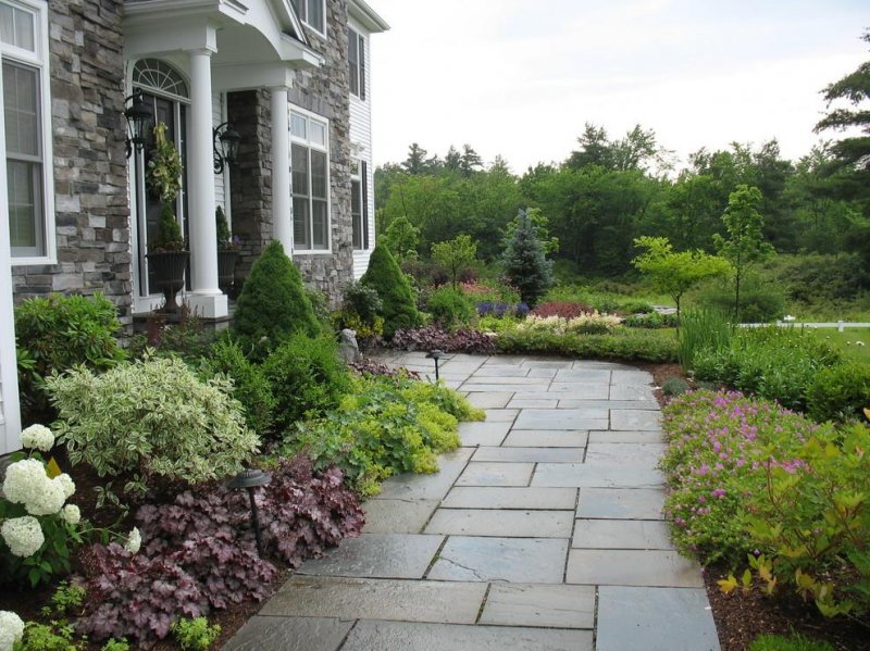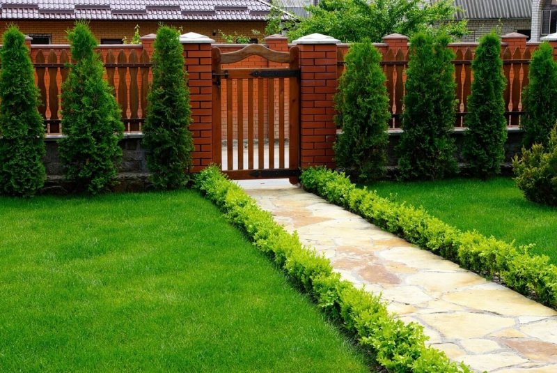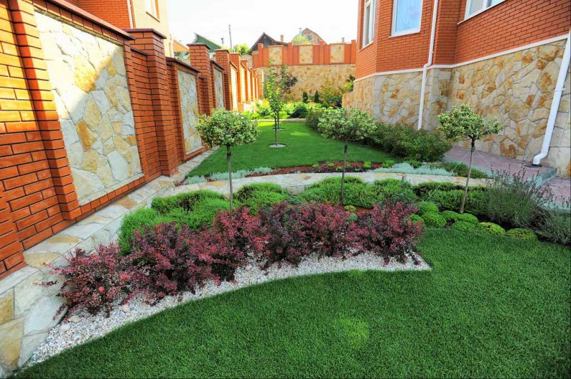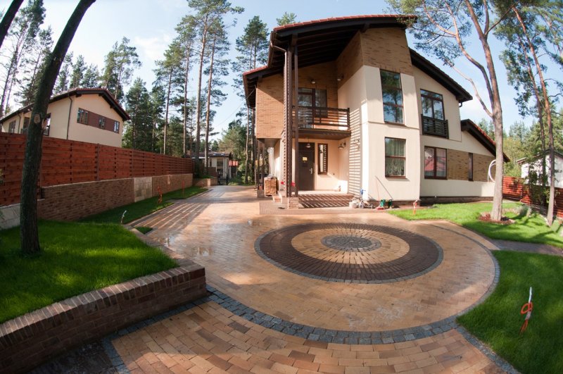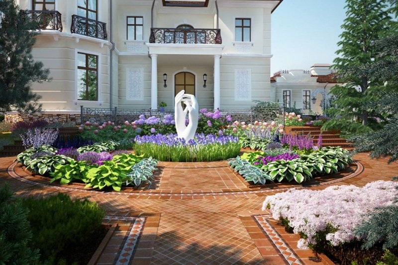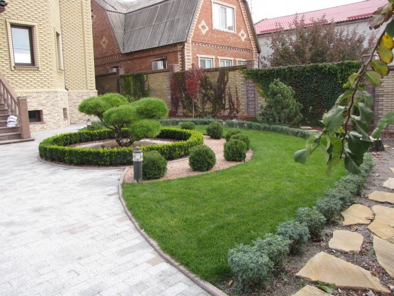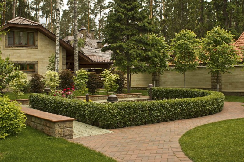 Ее можно разделить на въездную и входную подзоны. Для обустройства этой территории необходимо выбирать качественные облицовочные материалы. Вариативность стилей небольшая: стоит выделить ландшафтный и регулярный, их модификации. Во входную группу обычно входят партерные газоны, декоративные деревья, цветочные композиции. Иногда делают фонтаны, скамьи и небольшие беседки, уединенные зоны. Входную зону выполняют в форме прямоугольника, квадрата или фигуры с небольшими округленными формами. Оптимальная ширина дорожек — 1,2—2 метра. В качестве покрытия лучше выбирать плитку, но подойдет и цветная брусчатка. Главный элемент въездной зоны — ворота. Идеальная ширина — от 3,5—4 метров. Недалеко от въезда стоит выделить место для парковки. Схему заезда делают веерной или последовательной. Место стоянки автомобилей отгораживают решетками с декоративными растениями, иногда накрывают навесом. Во въездной зоне можно высадить декоративные кусты.