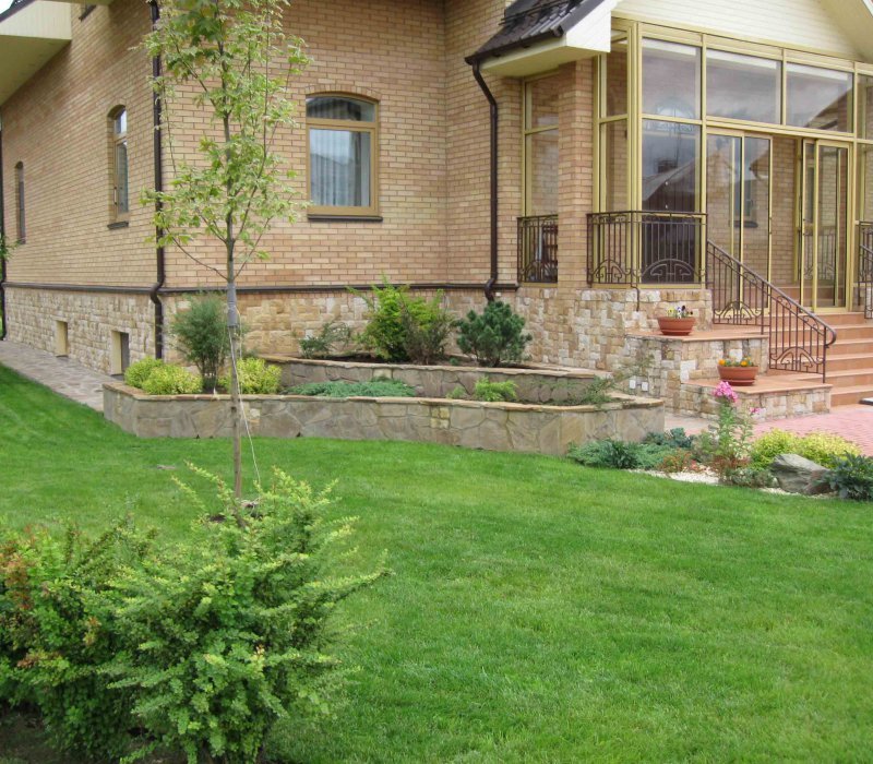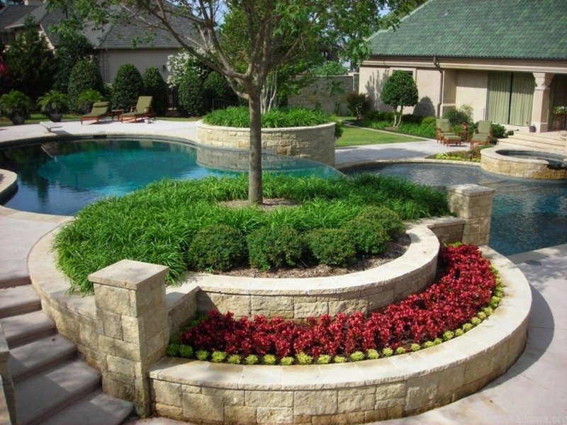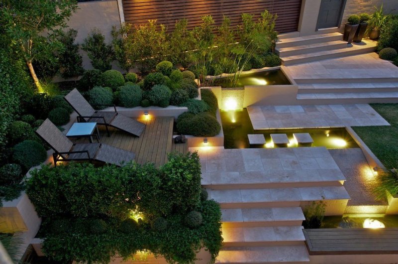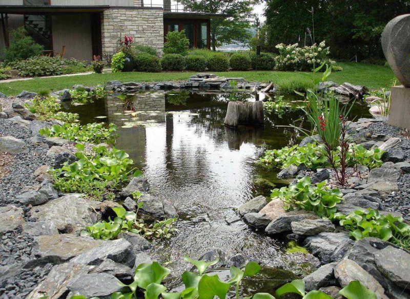 Задача ландшафтного дизайна может состоять как в изменении рельефа участка, так и в использовании существующих форм. Некоторые насыпи сложно выровнять. Из больших делают альпинарии, оформляют хвойными растениями и камнями. Иногда создают «сухой» ручей из окатышей и белых цветов по краям. Низину используют для создания пруда. Оптимальная глубина котлована — 1—2 метра. Пруд оснащают фильтрами и насосами. Низменность нельзя засаживать крупными растениями. Склоны оформляются подпорными стенками и цилиндрическими или прямоугольными габионами со щебнем. На подъемах высаживают спирею, дерен, магнолию. Небольшой холмистый участок обустраивают ступеньками. Это визуально увеличит территорию; будут выполняться функциональные задачи. Ступеньки делают в качестве продолжения дорожек. Желательно, чтобы угол наклона лестницы был небольшим.