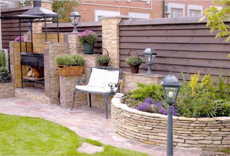 Полноценная частная территория не обходится без основных функциональных зон. Каждая требует правильного обустройства и декорирования. Внешнее ограждение — первое, что бросается в глаза. Его можно отделать покрытием с красивой текстурой или металлическими формами. Различные оградительные сооружения призваны подчеркнуть сад, создать уют. Садовую подзону принято обрамлять высокими растениями, чтобы создать тихое уединенное место. К большим перепадам высоты стоит относиться как к преимуществу. Многочисленные лестницы, узкие и широкие дорожки, небольшие рукотворные водопады помогут украсить территорию. На более-менее просторных дачных участках принято создавать искусственный водоем. Если в летний период надел будет функционировать, то понадобится большое количество внешнего освещения. В зимнее время его можно переделать на праздничное.