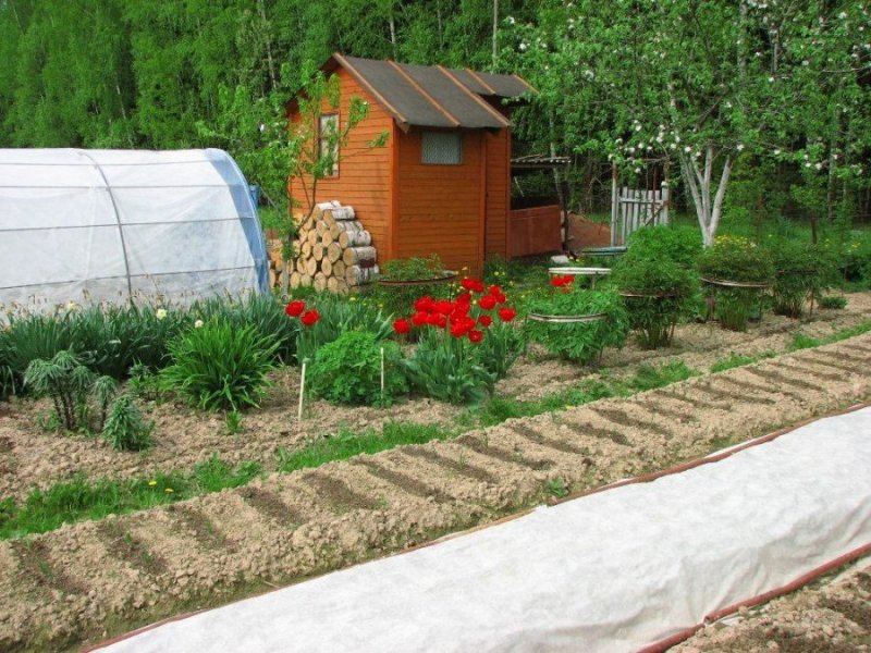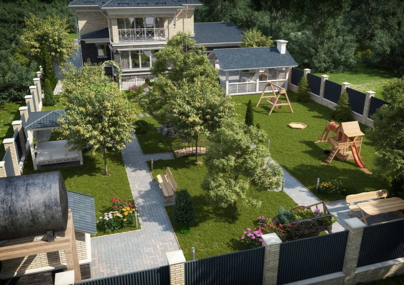 Территорию вокруг здания обустраивают минимум на 2/3 площади. Под зону отдыха в идеале выделяется вдвое больше земли, чем под садово-огородную и хозяйственную вместе взятые. Важны и расстояния между объектами. Вокруг дома и примыкающих построек оставляют 3 метра свободного пространства. От места содержания скота до других объектов должно быть не меньше 4 метров. На наветренной стороне высаживают ветроустойчивые растения одним плотным рядом, что позволяет использовать прилегающее пространство на полную. В регионах с большой ветровой нагрузкой посадку делают со всех сторон. Нормы пожарной безопасности требуют соблюдения 5-метровой дистанции между стенами здания и территорией за пределами участка. Нормы строительства предусматривают наличие 3-метрового расстояния между домом и соседним наделом (5-метрового, если дом деревянный), 2-метровой дистанции от средних по высоте деревьев и 4-метровой от высоких.