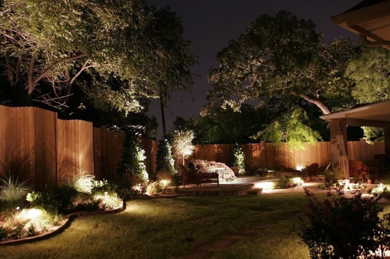 Выбор осветительных приборов для земельного участка практически неограничен: фигурки, ракушки, столбики, декоративные фонари, гирлянды; верхнее, нижнее, «лунное», перекрестное освещение, эффект отраженного света. Иллюминацию вешают на кусты, кроны деревьев, закрепляют между растениями. С ее помощью оформляют веранды, террасы, заграждения и навесы. Необычный вид имеют гирлянды с элементами большого размера, простые разноцветные лампы, светящиеся фигурки мультипликационных персонажей. Пруд оформляют точечными светодиодными лампами. Светильники в виде столбов обеспечат освещение дорожек. В процессе создания плана электрического подключения нужно решить, как именно приборы будут включаться и выключаться. Рекомендуется создать автоматизированную систему освещения. Управление осуществляется с помощью обычного временного, астрономического или сумеречного реле.