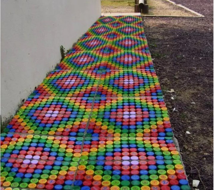 На даче может пригодиться даже обрезанная бутылка, используемая для выращивания рассады, пробка с нее. Разноцветные крышки легко становятся великолепным покрытием для садовой тропинки. Выложить тропку таким материалом довольно сложно, процесс занимает много времени. Придется потрудиться как пчеле, создающей соты. Но результат того стоит, декор получается эксклюзивным.