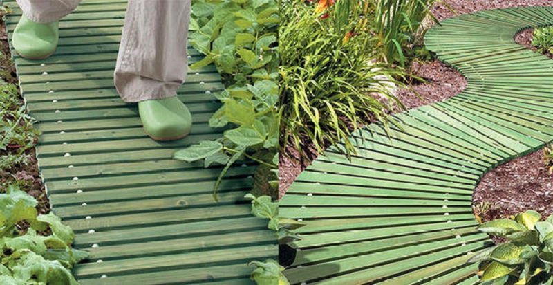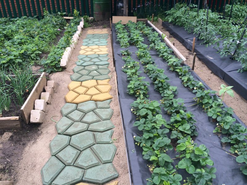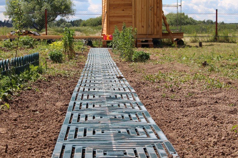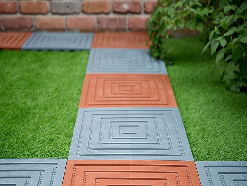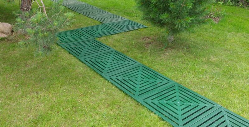 Альтернативой бетонным, кирпичным покрытиям могут служить тропинки, собранные из пластиковых плит. Они отличаются малым весом, конкурентной ценой, не требуют крепкого основания, свободно укладываются и демонтируются. Пластик невосприимчив к неблагоприятным погодным условиям, имеет длительный эксплуатационный срок.