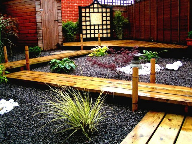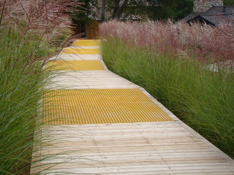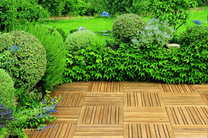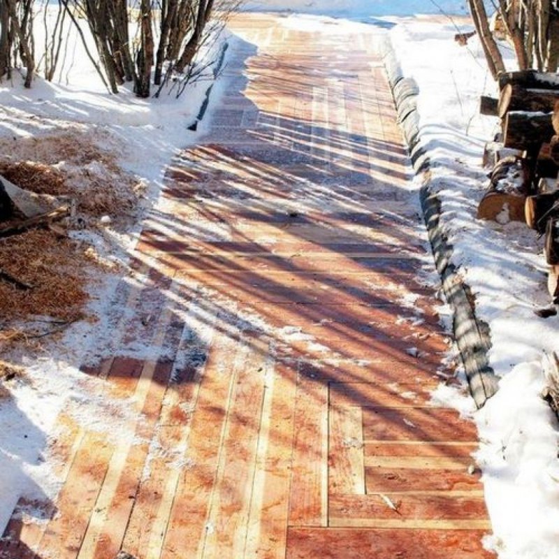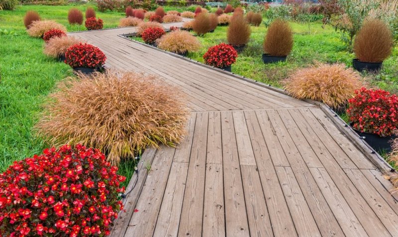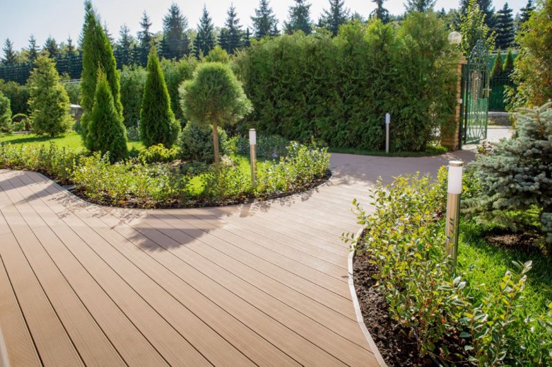 Укладка паркета осуществляется на песчаное основание, цементную стяжку. Подложка должна быть максимально гладкой – это главное требование монтажа. Выкладку делают под уклоном в несколько градусов. Это необходимое условие для стока воды с поверхности. Ширину следует выбирать с учетом стандартного размера изделия, чтобы на протяжении всей тропки не подрезать каждую доску. По бокам дорожку может украсить рабатка.