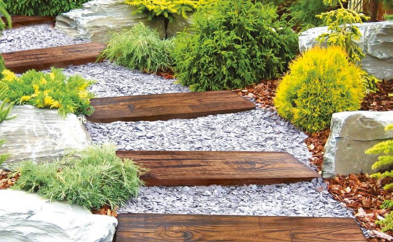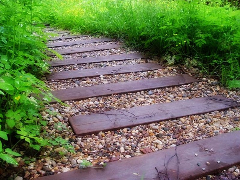 Можно использовать не только отдельные элементы сырья, будь то деревянные, кирпичные или бетонные настилы. Великолепно смотрятся комбинированные, смешанные виды покрытий. Например, щебень можно сочетать с дикарем, деревянные срезы с галькой. Важным элементом декора тропинки являются объекты, расположенные по бокам. Это могут быть горшки с цветами, декоративные насаждения, арки, насыпи из камня, фонарные столбы.