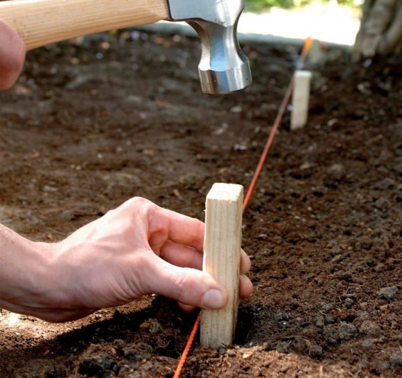 При наличии готового проекта можно переходить к следующему этапу – разметке дорожек на участке. Для этого понадобятся шаблоны – рейки, длина которых соответствует ширине будущих тропок. Наносить метки следует начинать от дома к объектам, расположенным по всей площади. Для этого с одной стороны спланированной стези в почву вбивают колышки, расстояние между которыми достигает двух метров на прямых участках пути, и нескольких сантиметров на извилистых, что позволяет делать плавные переходы. На колышки вдоль всего пути их следования натягивается веревка. Далее с помощью шаблона формируется соответствующая линия на другой стороне. Такой способ разметки применим для формирования основных и второстепенных путей.