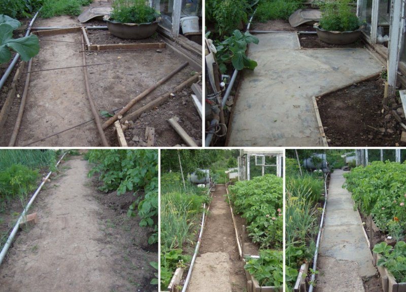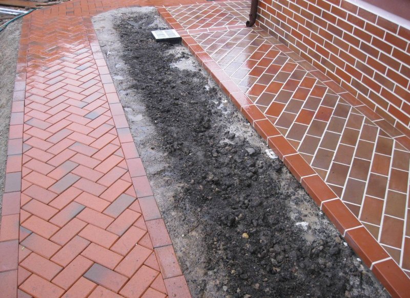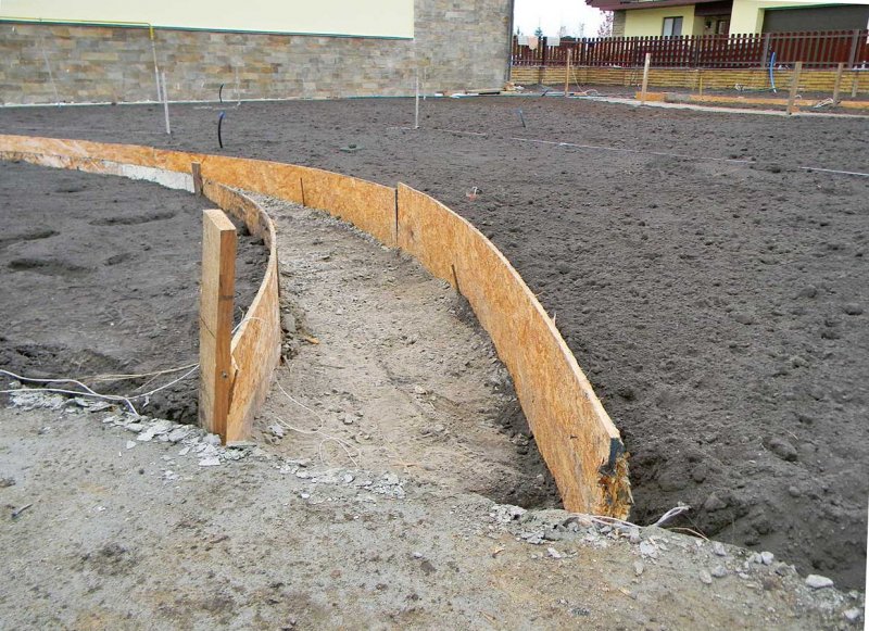 После нанесения разметки удаляется часть почвы (до 25 сантиметров). Траншею роют под малым уклоном, чтобы вода не задерживалась на поверхности. Со стороны наклона делают систему для отвода жидкости. В полученном рве утрамбовывают грунт, а стены по бокам усиливают досками, бордюрными ограждениями. Такие действия оберегают края от разрушения. Следующим шагом станет обработка дна канавы разными химическими веществами, которые уничтожат остатки корней сорных растений.
