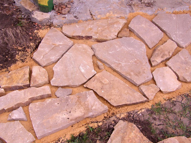 Обустройство тропинки начинается с подготовки основания. Оно может быть бетонным, состоять из песка, или цемента, перемешанного с песком. Каменная брусчатка, брекчия любого типа укладывается на бетонную базу. Булыжники лучше выкладывать на песок. Перемешанный цемент является универсальной основой.