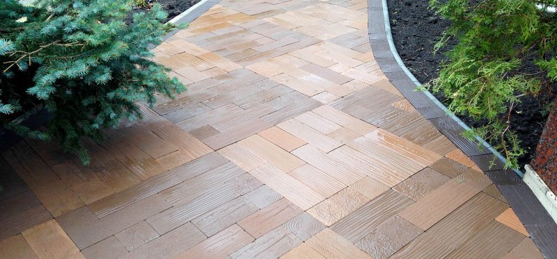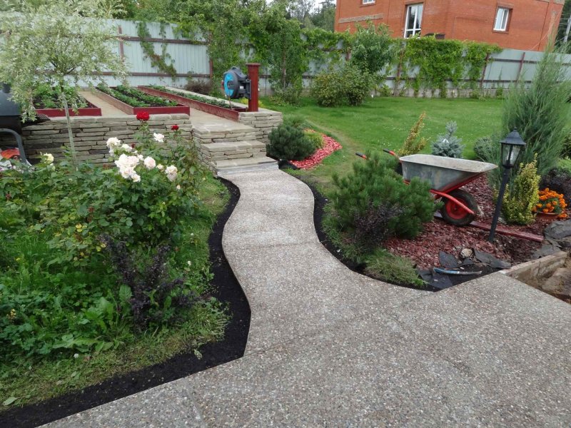 Материал отличается своей пластичностью. Из него выполняется отмостка вокруг дома, однако сырье хорошо использовать при создании бюджетных садовых дорожек. Оно великолепно имитирует разноцветную мозаику или природный камень. К тому же это очень прочное покрытие, по залитой тропке можно возить груженую тачку, тележку. Бетон обладает следующими положительными качествами: