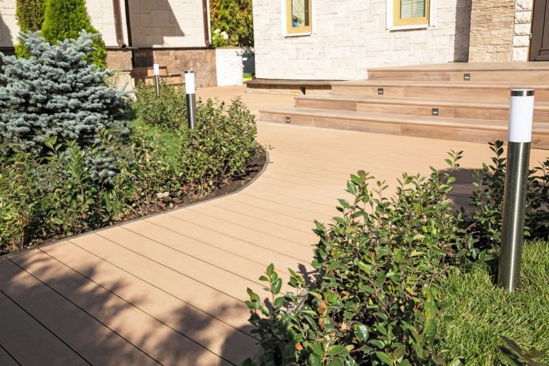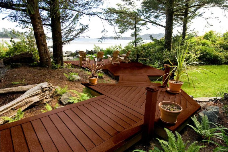 Используют при укладке террас. Ее еще именуют как декинг, хоть обозначение чаще применяют к садовому паркету. Древесно-полимерный композит составляет основу материала. Встречаются натуральные сорта террасной доски, наружная плоскость которой состоит из лиственницы, однако по внешнему виду не отличается от ДПК (опилки смешиваются с ПВХ компонентами).