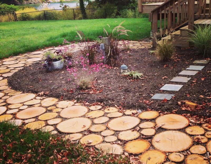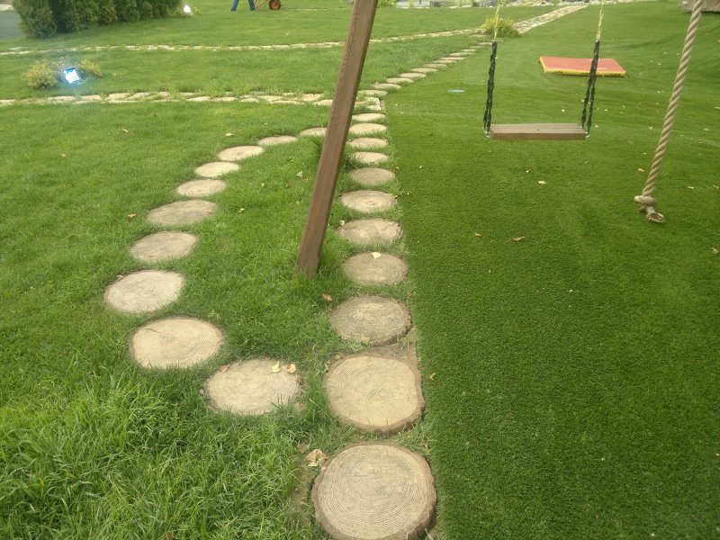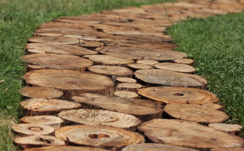 Тропинка может иметь разные названия: из срезов, бревенчатые торцы, полено, пенек. Сырье самое доступное, однако довольно тяжелое в обработке. Спил дерева – первый этап в строительстве тропок. Его делают предварительно, чтобы подготовить древесину. Лучше использовать деревья твердых пород. Идеальный вариант – лиственница, она долговечна, устойчива к разрушению.