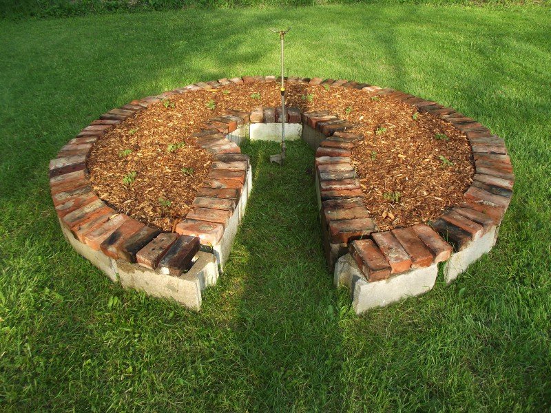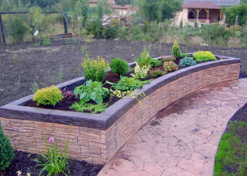Правильно подобранный материал по цвету, размеру впишется в любой ландшафт. Из природного камня или кирпича можно сделать обычные прямоугольные грядки, овальные, спиралевидные постройки. Натуральное сырье не крошится и не осыпается. Из недостатков можно отметить большой вес конструкции. Спустя несколько лет после установки она начинает грузнуть в земле. Каменное ограждение разбирают, подсыпают грунт и возводят заново.