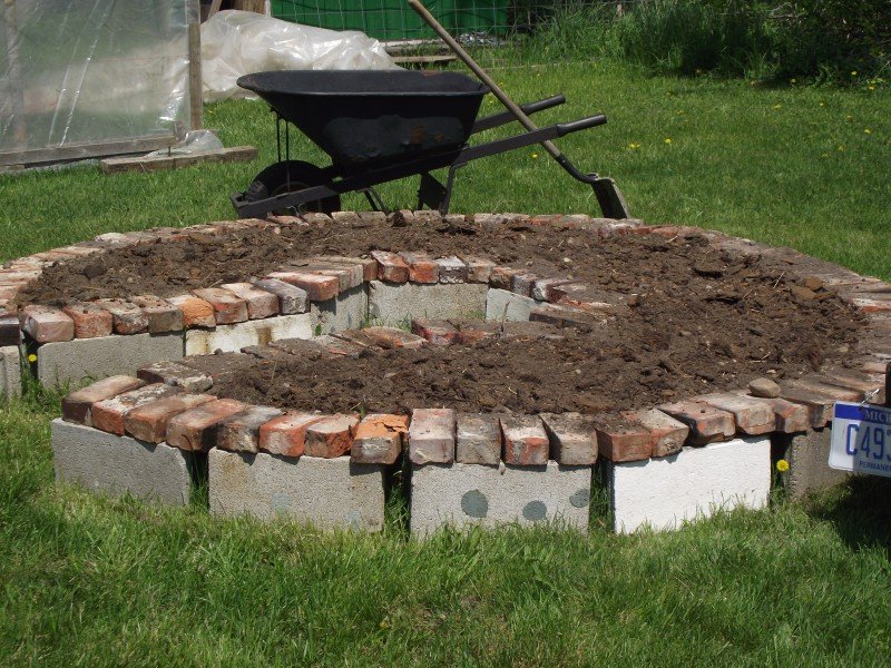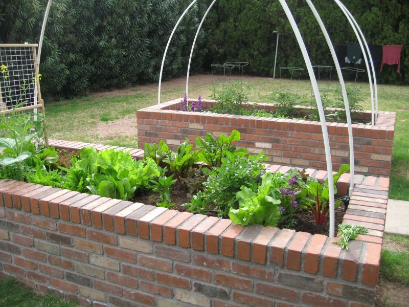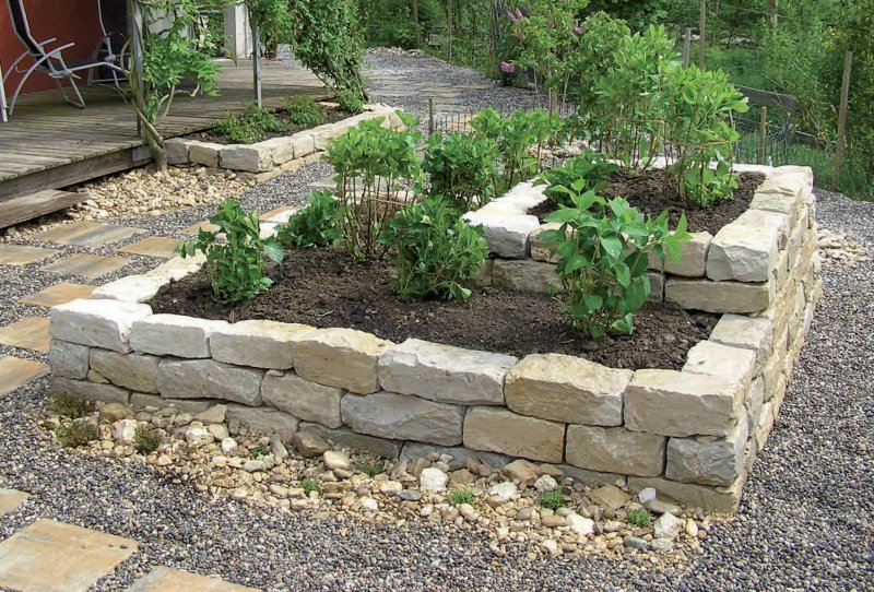Декоративно отделывать высокие грядки можно любой натуральной породой. Подойдет песчаник, базальт, галька, гранит, известняк. Булыжники выкладывают в несколько уровней на подготовленный фундамент, скрепляют цементным раствором снаружи конструкции. Внешняя сторона должна сохранить эффект «сухой кладки». Дно грядки необходимо покрыть полиэтиленом, рубероидом и засыпать землей. Высокие грядки из кирпича представляют собой полноценные стены на цементном растворе. Капитальное строение перенести на другое место не получится.