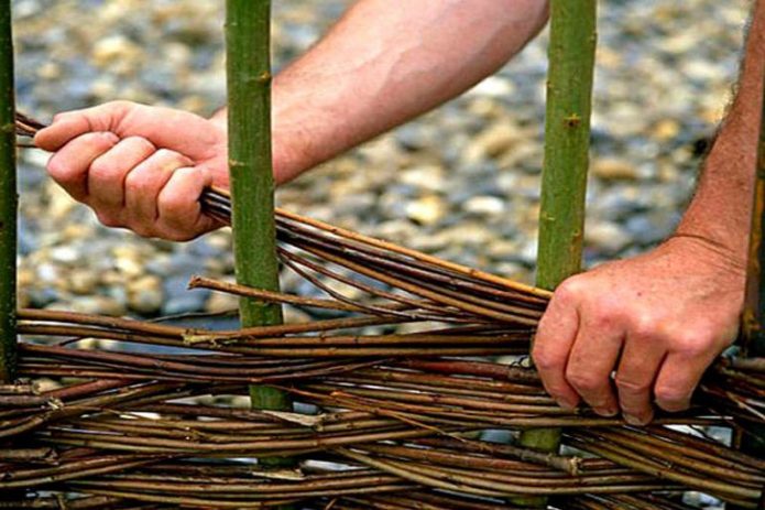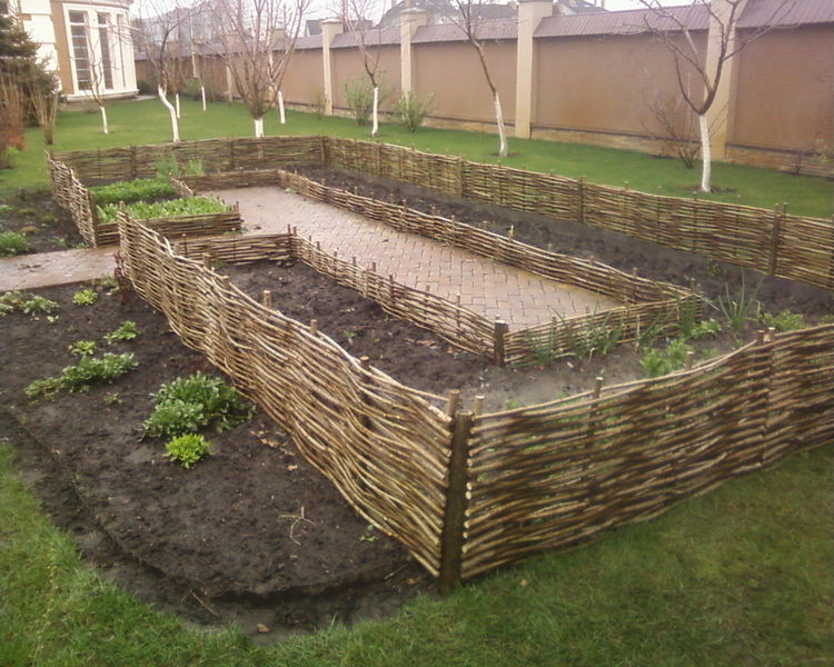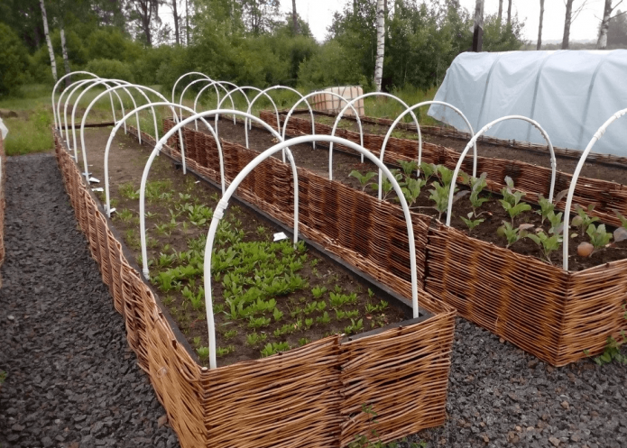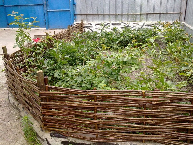 Подготовка материала подразумевает замачивание прутьев в воде на сутки. Затем распределяем деревянные колышки по периметру грядки, придавая нужную форму. Мелкие ветки кладем в центр конструкции – они будут дренажем, а крупные и ровные вплетаем между кольями. Бортики грядки с внутренней стороны следует обтянуть агроволокном, исключая высыпание почвы через щели.