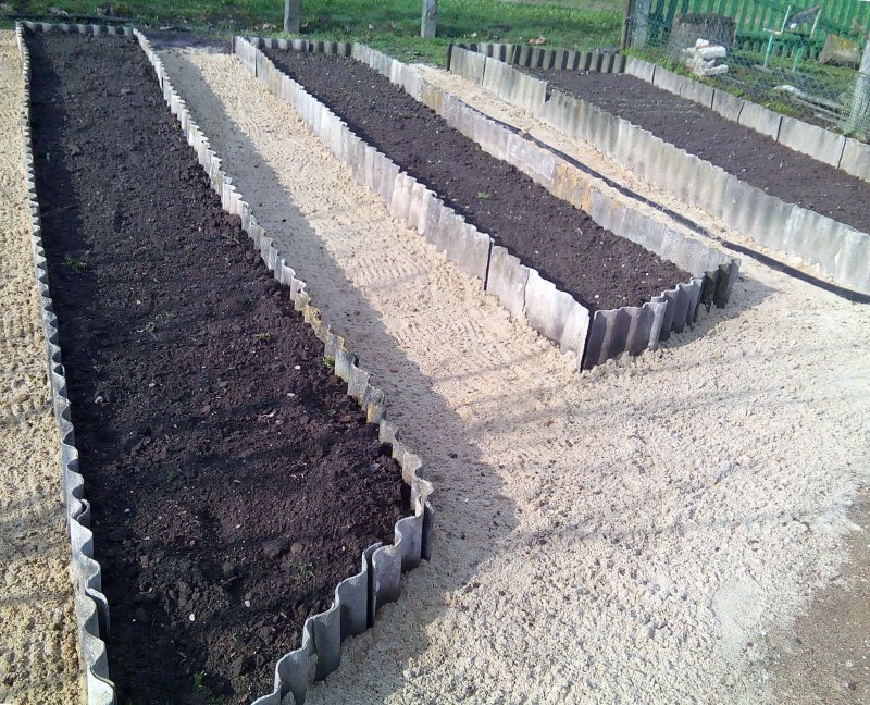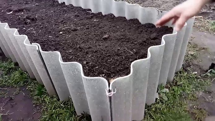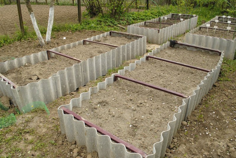 Сделать ограждения для грядок можно из плоского листового шифера или волнистых пластин. Большие листы соединяют болтами при помощи металлических уголков. Затем конструкцию помещают в подготовленную траншею, всыпают землю, утрамбовывают.