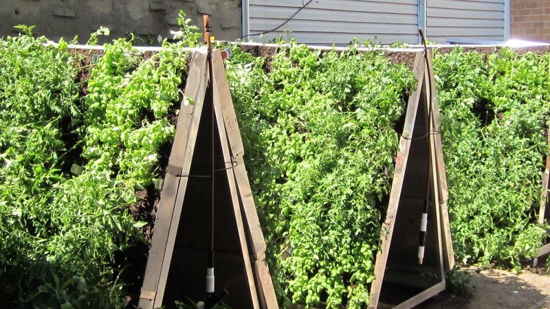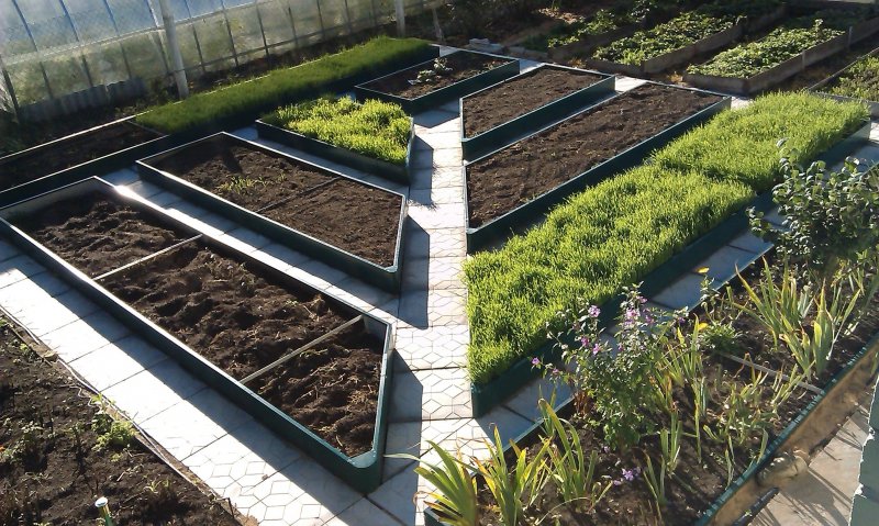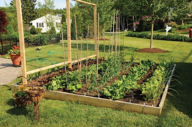 На высокой дачной грядке должно хватать места для растений, высадка которых производится в два ряда. Такое расположение обеспечивает достаточный объем воздуха и света для всех культур. Длина клумбы может быть любой, ограничения создает только площадь самого участка, возможности капельного полива.