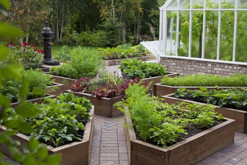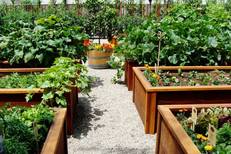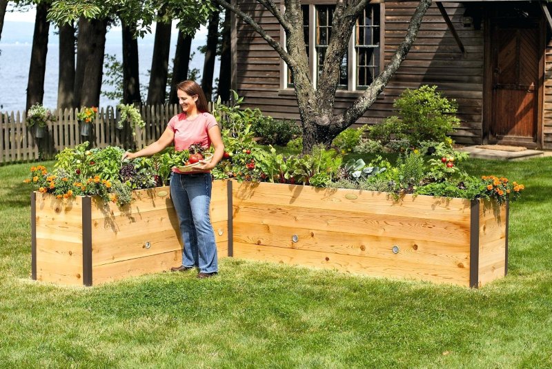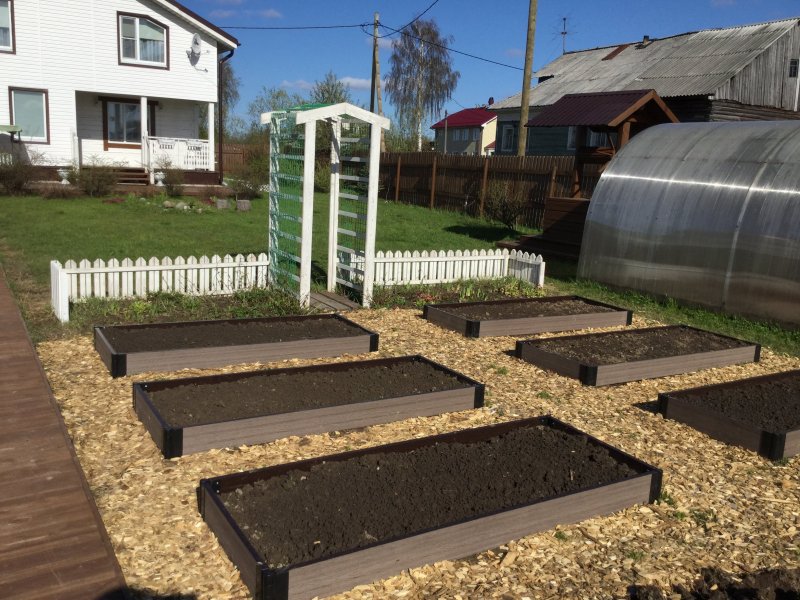 Владельцы дач и загородных домов стремятся сделать свою жизнь независимой от огородных забот, но в то же время хотят получить большой урожай. Обработка земли традиционным способом требует много времени, а результат не всегда соответствует ожиданию. На небольшом участке с дефицитом места можно разместить оригинальные грядки, дающие массу преимуществ для выращивания различных культур. Такой подход позволит увеличить урожайность на неплодородной почве, создать интересный дизайн. Содержание Где разместить грядки – выбор места Разновидности грядок Преимущества высоких грядок Оптимальные размеры и форма грядок Материалы для ограждения и их особенности Дерево Террасная доска Камень и кирпич Пластик Металл Бетон Лоза и прутья Шифер Дорожки между грядок Обустраиваем высокую грядку из бруса своими руками Выбор, разметка и подготовка участка Обработка и сборка каркаса Наполнение грядки Как ухаживать за высокими грядками Заключение Где разместить грядки – выбор места На урожайность влияет множество факторов – это качество почвы, время посадки, своевременная обработка земли и прочее. Помимо основных моментов, рост культур зависит от выбранного места на участке, совместимости овощей. Выбирать место для грядок необходимо одновременно с планированием застройки участка. Огород должен располагаться на самой освещенной территории, снабженной поливом. Также следует учитывать особенности почвы, климатические условия в регионе, рельеф. На небольших участках уместно разместить высокие грядки с многолетними растениями. Если сделать их мобильными, культуры можно будет убирать на зиму в тепло, исключая вымерзание. Располагать культуры следует с учетом их требований к почве. В отдельной зоне с постоянным питанием земли должны произрастать капуста, картофель, огурцы, чеснок. Морковь, лук, свекла, перец менее требовательны к почве. Таким овощам достаточного простого ежедневного полива. Грядкам с бобовыми культурами не нужен дополнительный уход. Их можно расположить в тенистом месте. Разновидности грядок Содержать приусадебный участок в порядке очень просто. Начинать его благоустраивать необходимо с разделения на отдельные зоны – грядки. Это облегчит уход за растениями, сделает возможным ведение севооборота. Место посадки культур может быть стационарным или временным. В неблагоприятных условиях, в засушливом климате, на маленьких площадях можно использовать следующие разновидности грядок: Высокие. Грунт в приподнятых над землей грядках лучше прогревается за счет нагрева стенок конструкции. Урожай не зависит от качества земли на участке, а борьба с сорняками сводится к минимуму. Овощи можно высаживать раньше на несколько недель. Созревание ускоряется за счет особенной дренажной системы. Почва высоких грядок не вымерзает, защищена от размыва во время дождя. Вертикальные. Применяют на маленьких участках. Высота каскадных сооружений не ограничена. Компактные грядки дополнят ландшафтный дизайн частного дома, скроют недостатки неприглядных строений. Ухаживать за культурами в вертикальной конструкции можно, не испытывая физического дискомфорта. Грядки расположены на удобной высоте. Растения меньше болеют, не подвергаются нападению вредителей. Французские. Красивые грядки правильной формы с бордюрными ограждениями из бр