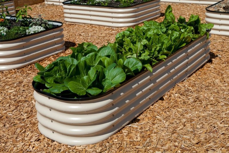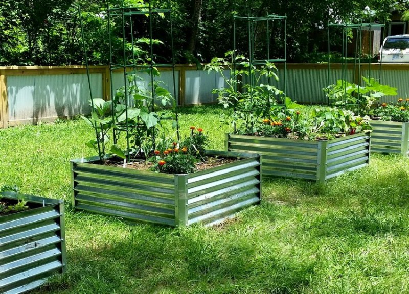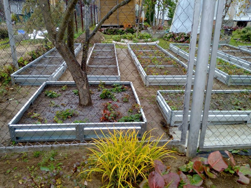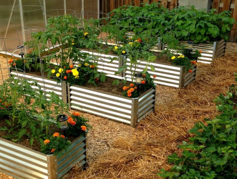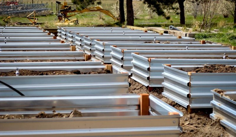 Металлическая грядка быстро и легко собирается. Ее можно убрать на зимовку в сарай, весной поставить на новое место. Листовой бордюр имеет малый вес, способность соединяться в длину и высоту. Из металла можно сделать высокие грядки, маленькие заборчики любой формы. При желании их можно покрасить в любой цвет.