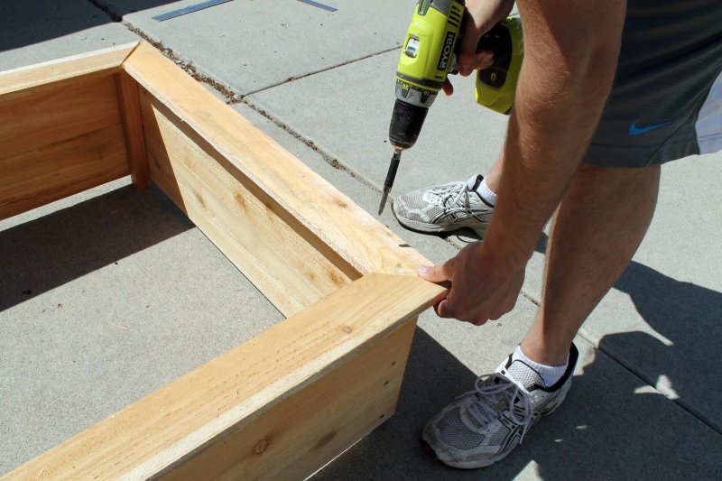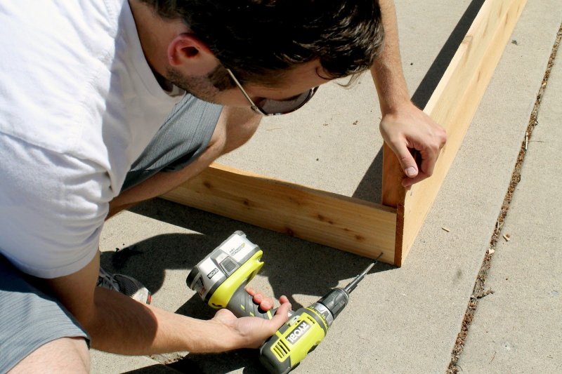 Устанавливают высокую грядку только в сухой грунт. На выбранном месте скрепляют подготовленные доски с помощью шурупов или гвоздей, регулируя желаемую высоту изделия. Центр и углы можно укрепить брусьями – это значительно повысит прочность конструкции. После углубления всех сторон в землю, конструкцию выравнивают по уровню. Она должна быть идеально ровной, иначе влага будет скапливаться в одном месте, что приведет к порче древесины и посевов.