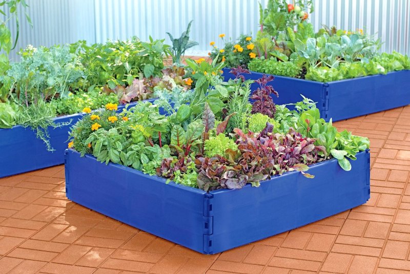 Панели ПВХ. Конструкция собирается при помощи угловых креплений. Для создания высоких грядок необходимо панели установить друг на друга.
