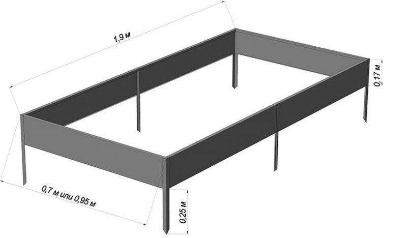 Первым делом готовим деревянную опалубку. Ширина формы для заливки должна быть не меньше 15 см. Она должна иметь плотное прилегание во всех точках грунта. Выравненную форму заливаем раствором, помещаем арматуру. После полного высыхания опалубку снимают и засыпают грядку землей.