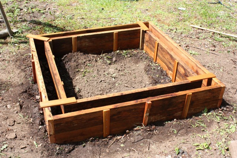 Просушенные брусья сбивают попарно до нужного размера, соединяют с помощью брусков. Высота коротких и длинных изделий должна быть равна высоте грядки. Конструкции сомнительной надежности следует укрепить в нескольких местах поперечными брусьями. Угловые брусья-колышки должны выступать минимум на 10 см. Декорировать каркас можно с внешней стороны красивыми досками, покрытыми лаком.