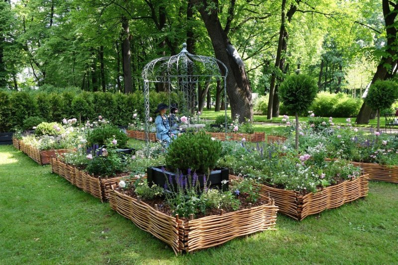 Французские. Красивые грядки правильной формы с бордюрными ограждениями из бруса, досок, кирпича. Конструкции могут быть приподнятыми или находиться на уровне земли. Центр композиции обычно обозначают небольшой уличной скульптурой, фонтаном. Отходящие дорожки разбивают территорию на симметричные цветочные клумбы, прямоугольные участки.