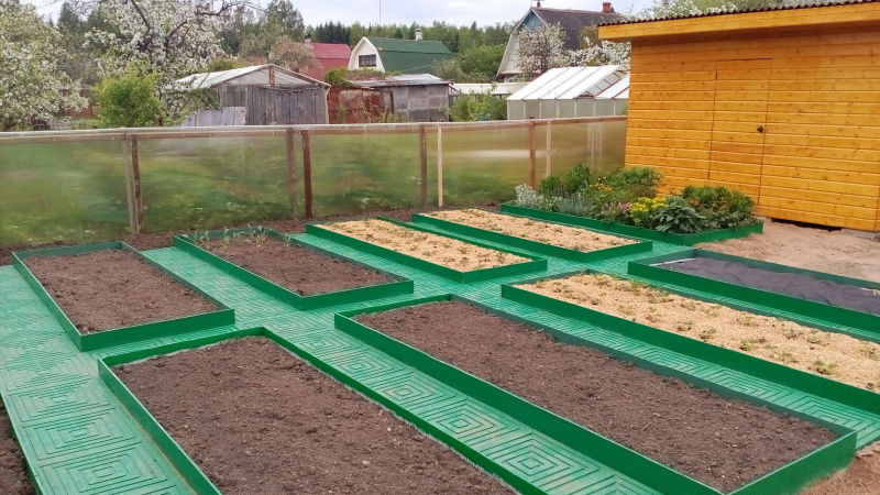 Пластик для грядок не выделяет в почву токсичных веществ при нагревании. Он не привлекает насекомых и мелких грызунов. Ему не страшна коррозия, гниение. Сделать различного вида грядки можно из следующих материалов: