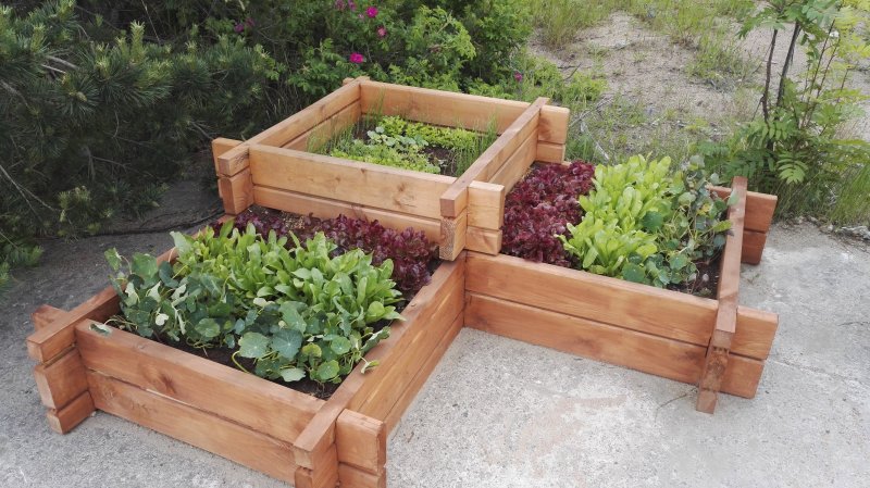 Большинство дачников предпочитают делать высокие грядки из бруса. Натуральный материал должен быть широким и плотным, особенно, если каркас многоуровневый. Для овощных культур делают большие конструкции, продольно располагая древесину. Красивые цветы высаживают в клумбы из бруса, поставленного вертикально, в виде пеньков. Любая грядка из дерева должна быть обита изнутри изолирующим контакт с почвой материалом (железом, пленкой, агроволокном).