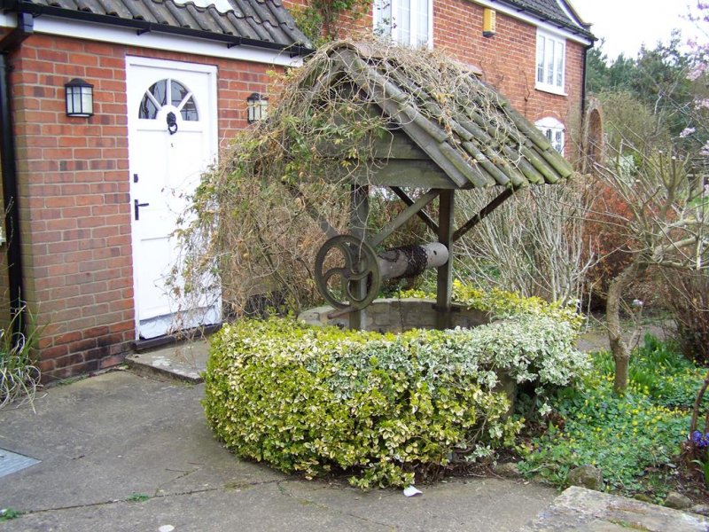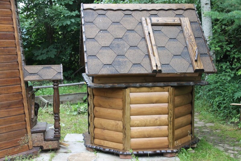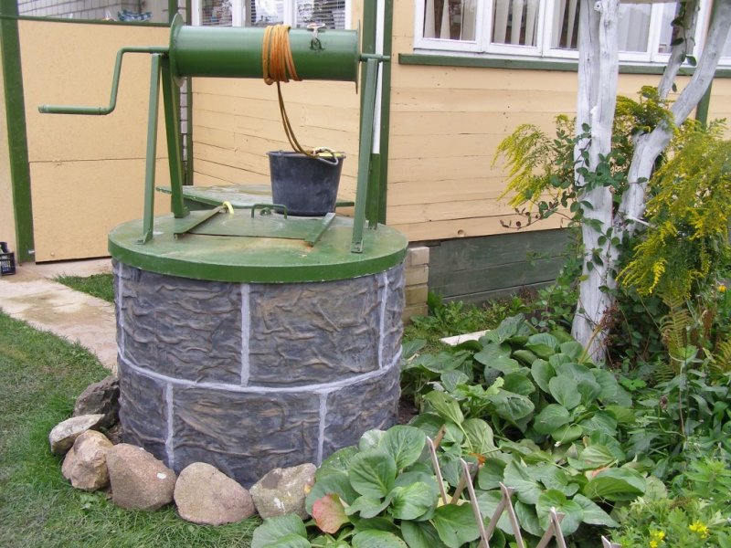 Существует много актуальных вариантов оформления колодца. Все зависит от стиля конструкции, например: