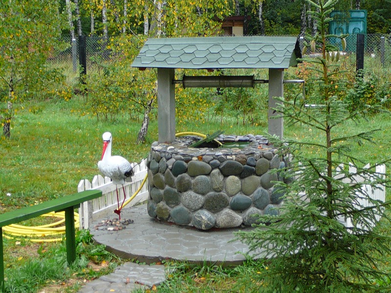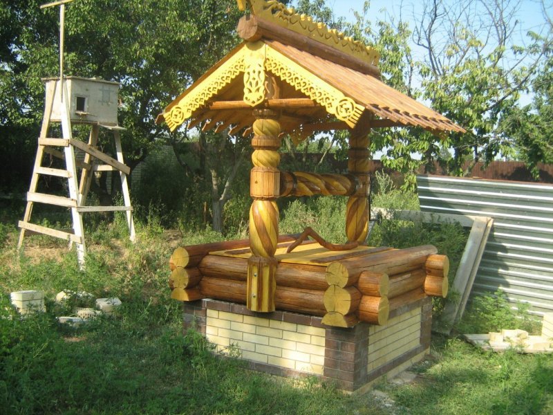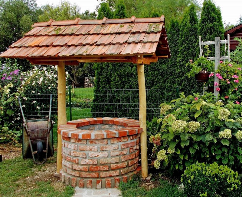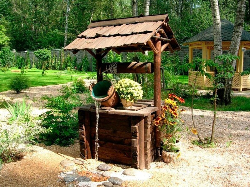 Колодец по праву можно назвать символом цивилизации. С момента появления гидротехнических сооружений люди отказались от кочевого образа жизни, перешли к оседлому. Источник воды был при каждом придомовом участке. Но если раньше он использовался непосредственно для хозяйственных нужд, то сейчас применяется и для декоративных целей, украшая собой общий дизайн усадьбы, частного дома. Содержание Особенности оформления Виды колодцев Проект и функции колодца Советы и меры предосторожности при самостоятельном строительстве колодца Как выбрать место для колодца Выбор отделочных материалов Дерево Кирпич и его разновидности Камень Отделочные материалы и их способы комбинирования Дизайн и стиль оформления Как соорудить домик над колодцем Как соорудить навес для колодца Идеи оформления декоративного колодца Как содержать колодец в чистоте Заключение Особенности оформления Отделка конструкции выбирается в зависимости от стиля всего участка, должна сочетаться с экстерьером основной постройки. Может быть выполнена из следующих материалов: камень дикарь, дерево, бетон, пластик, кирпич, штукатурка, с использованием другого сырья. Главное, чтобы стройматериал был износостойким, не портился от изменения температуры. Обдумывая дизайн сооружения, следует обратить внимание на необходимость периодического обслуживания криницы, а именно проведение чистки и дезинфекции. Соответственно доступ к оголовку следует делать свободным, а элементы декора не должны препятствовать осуществлению вспомогательных работ. Обычные облицовочные материалы могут выглядеть довольно унылыми, поэтому часто колодцы окрашивают разноцветными красками, делают декоративную роспись, которую свободно можно выполнить самостоятельно, даже при отсутствии живописных талантов, достаточно воспользоваться трафаретами. Кроме покраски можно воспользоваться флористикой, создать вокруг композицию из цветов. Конструкция может использоваться для добычи воды или в декоративных целях. Если рассматривается практическое применение, то необходимо обезопасить ее от попадания внутрь нечистот, для этого оголовок делают выше, вокруг заливают отмостку, ее накрывают или устанавливают крышу. Виды колодцев Сооружения могут использоваться как для получения воды, так и для ее удаления, имеют название инфильтрационные и поглощающие соответственно. Представляют собой углубления в земле, которые достигают водоносного горизонта. Они могут уходить вглубь на несколько сотен метров (артезианские скважины). В зависимости от вида грунта, необходимого объема добываемой воды, глубины ее залегания, ландшафта, а также технических возможностей можно обустраивать ключевые, срубовые, буровые колодцы. Есть также декоративные модели, которые используются в основном для эстетического наслаждения. Рассмотрим подробно существующие виды: Ключевой. Строительные работы не занимают много времени, материальные затраты минимальны. Главное условие – наличие на поверхности источника. Для восходящих родников, которые выходят на поверхность вследствие нарушения целостности водонепроницаемых пород, делают забетонированную круглую или квадратную площадку, углубленную на 20 см. Если же ключ нисходящий, то дополнительно устанавливают фильтр. Шахтный. Сооружается при условии залегания вод н
