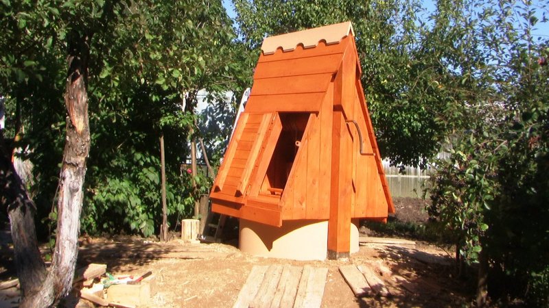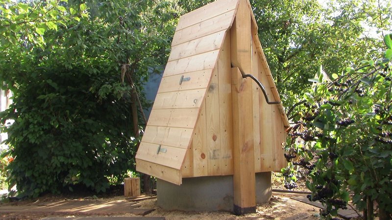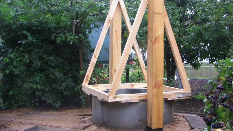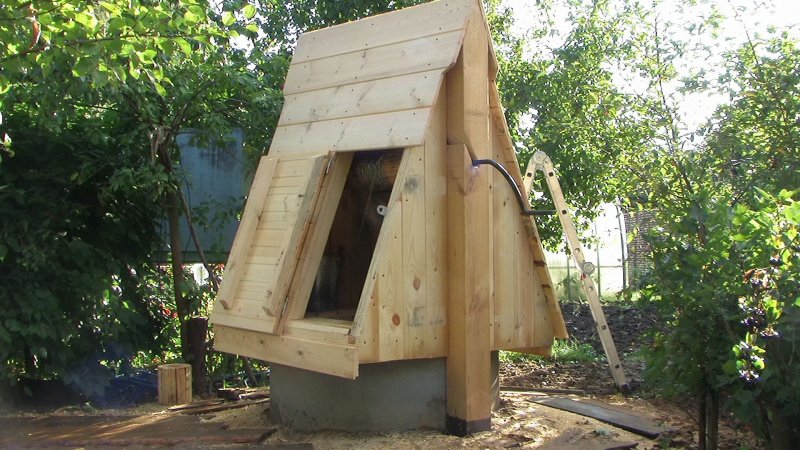 Над шахтой лучше установить крышу, которая защитит углубление от атмосферных осадков, листьев, других посторонних объектов. К тому же, это отличный декоративный элемент.