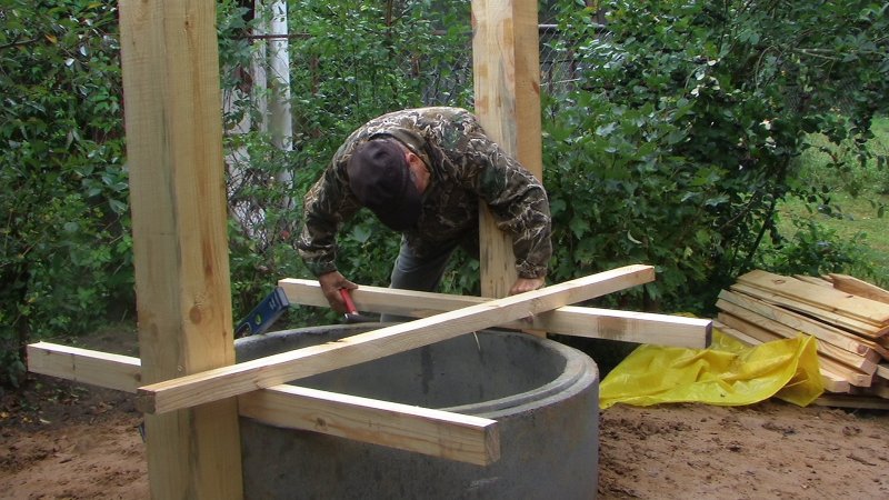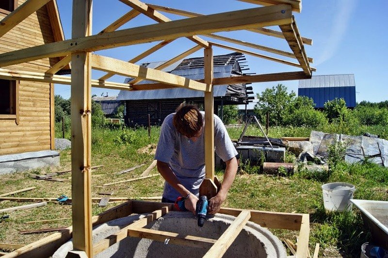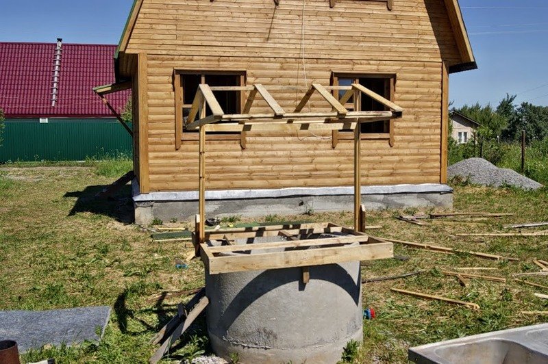 Построенный на даче или у дома колодец – востребованное сооружение. Однако бетонное кольцо, выходящее из земли, имеет незаконченный вид, выглядит недостаточно эстетично. К тому же вода из открытых конструкций пригодна только для полива. Положение спасет установка домика. Он защищает шахту от разного рода загрязнений, обеспечивает безопасность, особенно для маленьких детей. Могут быть двух видов – отрытые, закрытые. Надстройку можно соорудить своими руками. Для наглядности рассмотрим мастер-класс, в котором поэтапно описан порядок действий по сооружению домика с двухскатной кровлей: