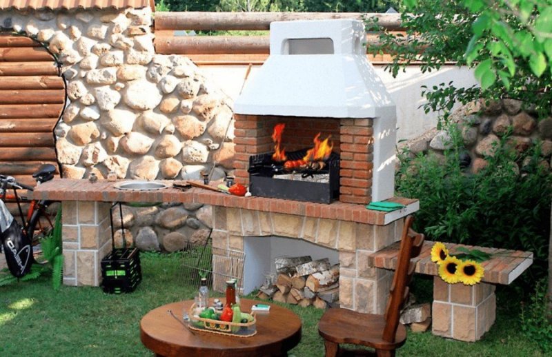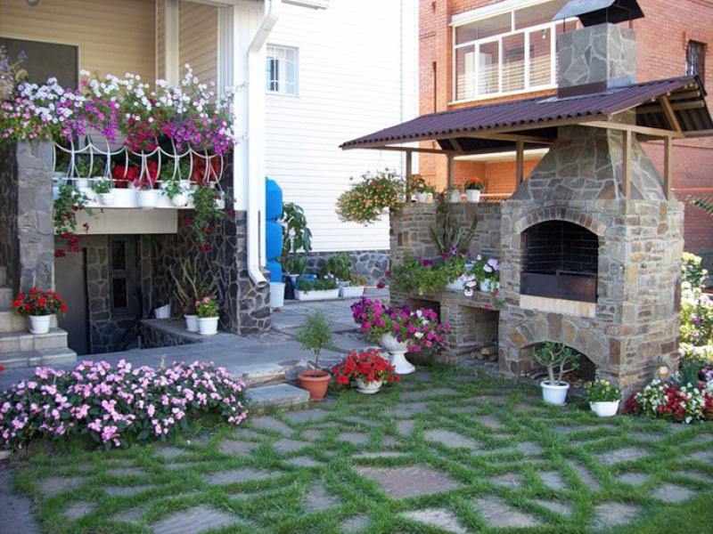 Мангал отлично смотрится в ландшафтном дизайне, но место лучше выбирать как можно более отдаленное от растений. Затем следуют подготовительные работы. Нужно сделать чертежи, определиться с окончательным проектом и подготовить нужные приспособления. Понадобятся обрешетки, бутовый камень, песок, цемент, арматура, гравий, огнеупорные кирпичи. Для красивого оформления швов потребуется расшивка. Дальнейшие работы начинаются с рытья ямы нужного размера, формы и глубины. В нее закладывается фундамент. Затем цементно-песчаную смесь оставляют для застывания. В интернете можно найти достаточное количество чертежей кладки кирпича. Они понадобятся для следующего этапа работ. После каждых 2—3 рядов конструкция проверяется строительным уровнем на предмет наличия уклона. Заключительная стадия работ начинается с отделки облицовочными материалами. Потом готовое сооружение оформляют и обустраивают необходимыми принадлежностями.