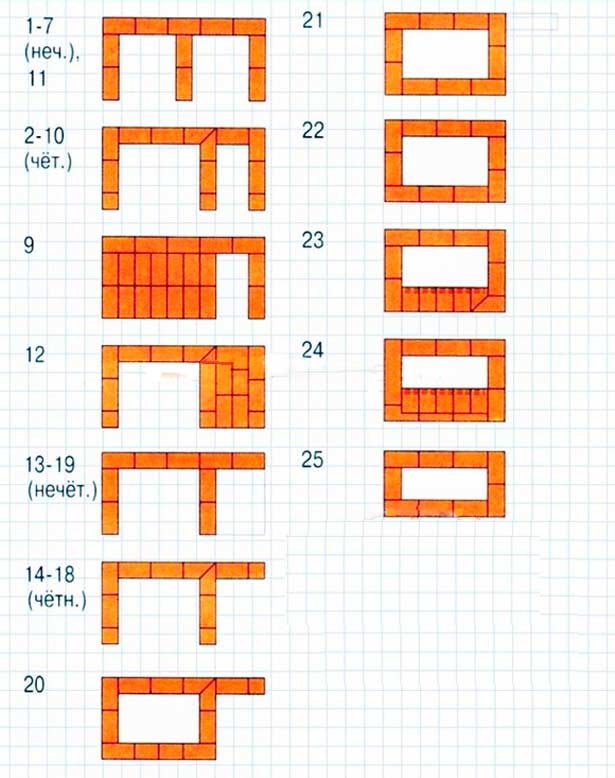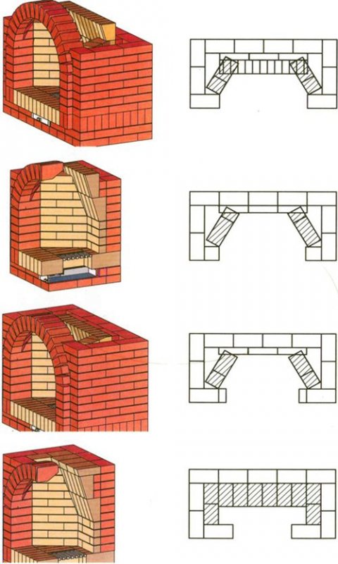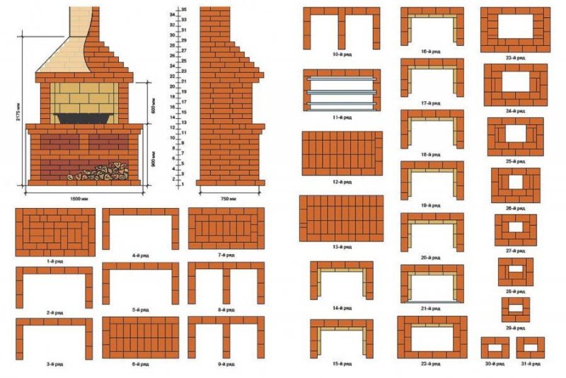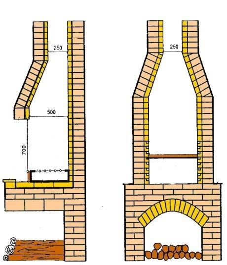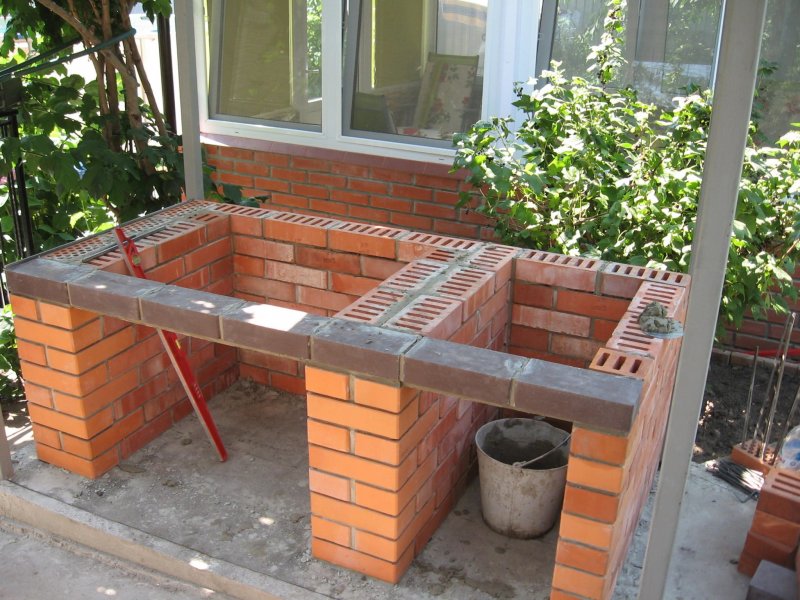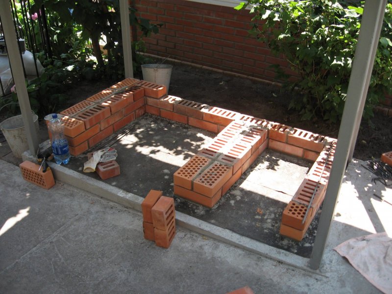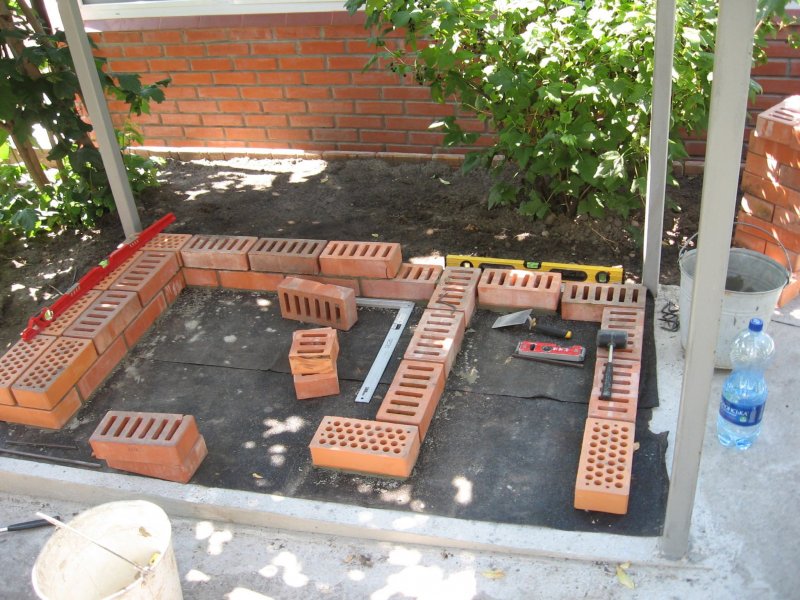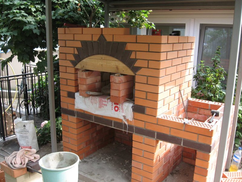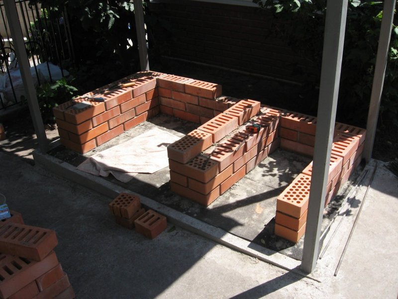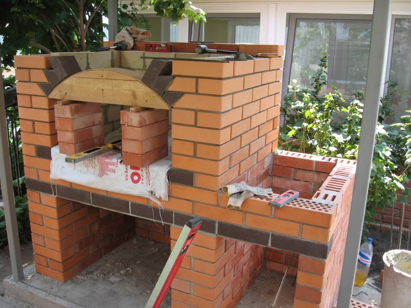 Один из самых простых способов кладки — сдвигание каждого последующего ряда на полкирпича в сторону. Цоколь выкладывают от углов до центральной части, по проведенным линиям. Каждые три новых ряда проверяют строительным уровнем. Первые два делаются сплошными. Высота цоколя подбирается индивидуально. В процессе возведения мангала создаются секции для кухонной утвари, угля, дров. Топливник выкладывается после этих камер. Место для жарки делается из кирпича или заранее приготовленного бетонного основания. В большинстве случаев топливник выполняется в виде арки. Во время работ дуга из кирпичей поддерживается кружалом. Необходимый просвет между элементами — 1 см. Топливник накрывают уголком или балкой. Рядом с жаровней оставляют небольшие щели, чтобы горение было лучше. В конце делаются дымосборник и ветровые стены. Над трубой крепят небольшой козырек для защиты от дождя. Большая стена и дымосборник не являются обязательными элементами.