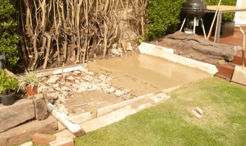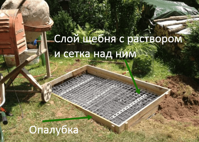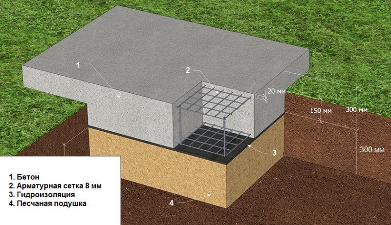 Сначала вырывается яма в соответствии с размерами спроектированной конструкции. Дно выкладывается щебнем и бутовым камнем. Затем устанавливают опалубку. Если размер ямы небольшой, а ее стенки не имеют наклона, то можно обойтись без нее. Цемент и песок перемешивают в соотношении 3:1. Полученная смесь заливается в яму несколькими слоями с поочередным укладыванием сетки из арматурных прутьев. Нижний слой арматуры устанавливается так, чтобы не было контакта с дном. Фундамент накрывают пленкой или рубероидом. В жаркую погоду поверхность сохнет неравномерно, поэтому ее время от времени обрызгивают водой. Через одну-две недели на идеально сухой бетон кладутся кирпичи. За это время готовят раствор. Идеальная смесь по свойствам напоминает густую сметану. Если скатать ее в полоску, она не растечется и будет сохранять форму.