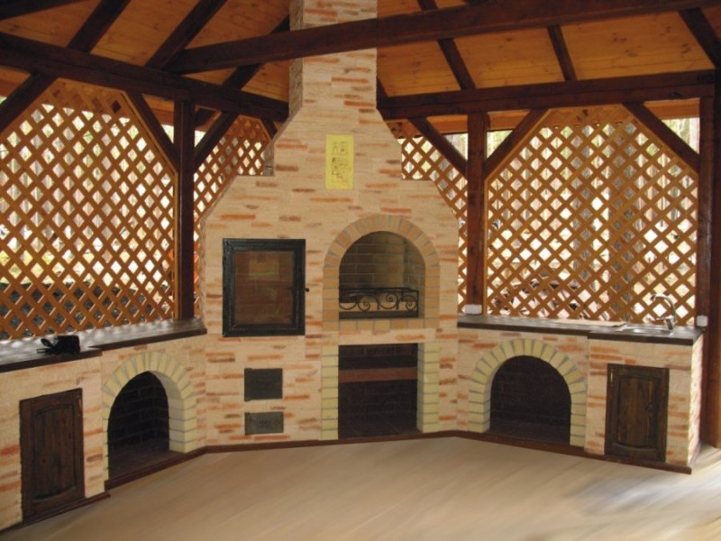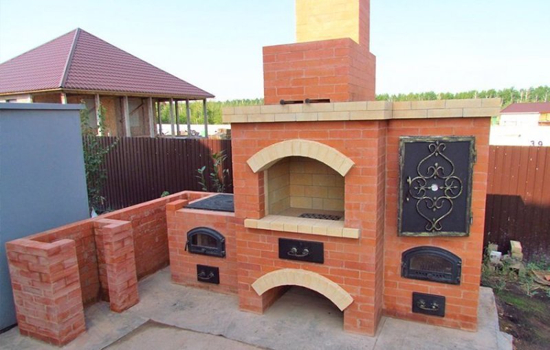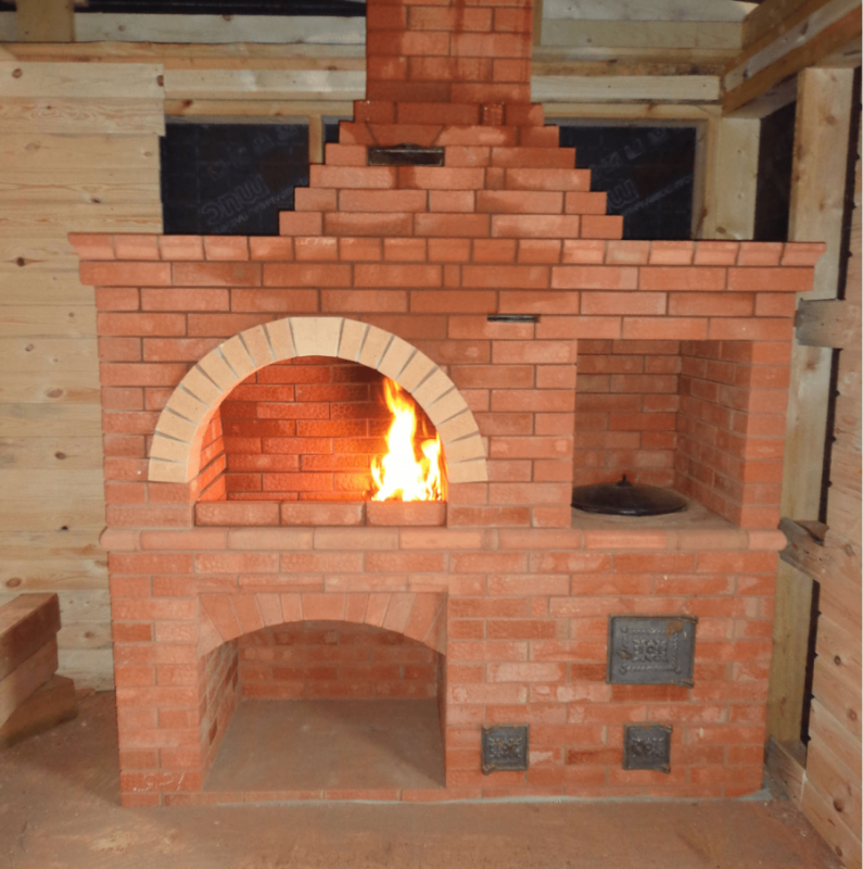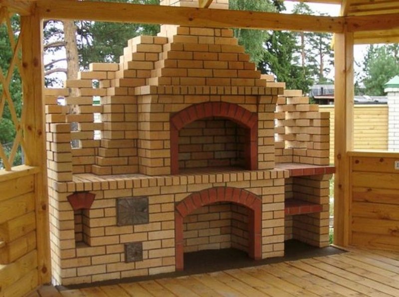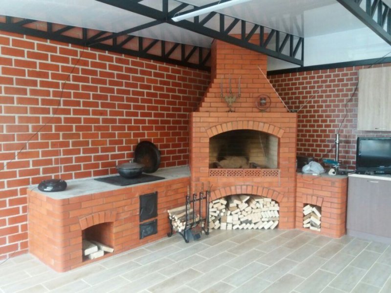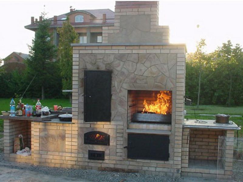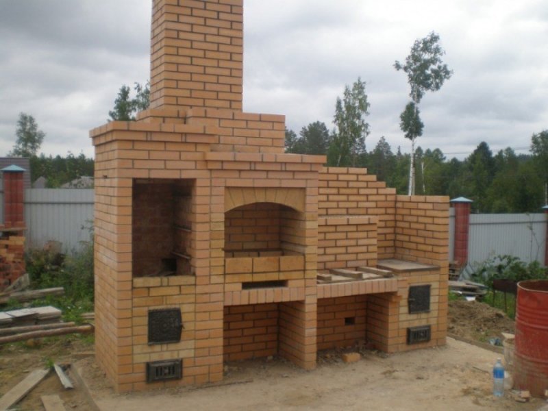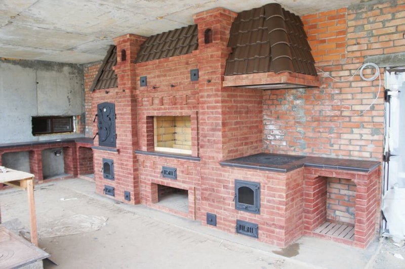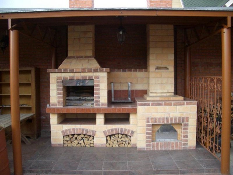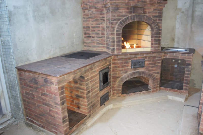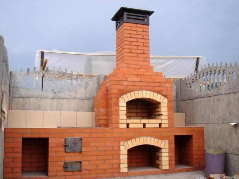 Это универсальное приспособление для жарки блюд с несколькими топливниками. Конструкция должна иметь прочное основание. В центральной части проектируется несколько зон для готовки. По краям следует разместить по одной большой столешнице. Печки можно будет использовать и для приготовления блюд на ровной поверхности. Центральная камера должна быть обустроена для размещения решеток, а традиционные русские печки лучше делать сбоку. Первый этап строительства — рытье котлована. Затем создается песчаная подушка. Она накрывается слоем щебня, вдвое-втрое больше песчаного. Так как объект будет большим, фундаменту нужно «оставить» 2—3 недели для полного застывания. Его необходимо время от времени поливать небольшим количеством воды. Основной этап — кладка кирпичей. Печки выделяются 4 столбиками или 3 стенками, кроме передней. Процесс возведения нескольких печек сложнее, чем обычной конструкции с одной жаровней и дополнительными секциями.