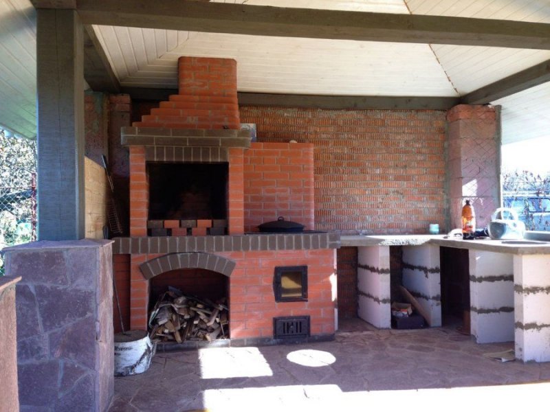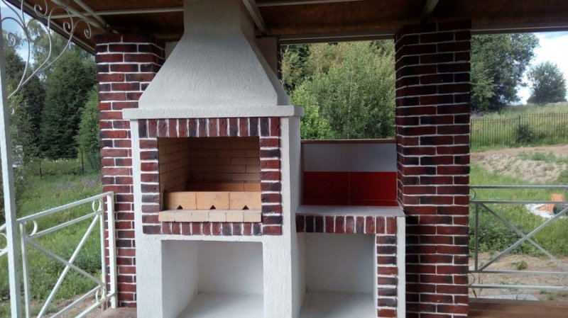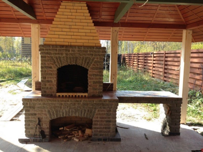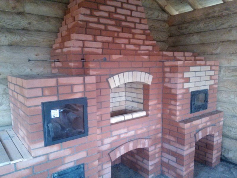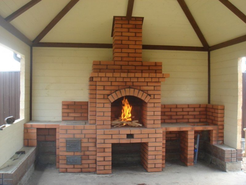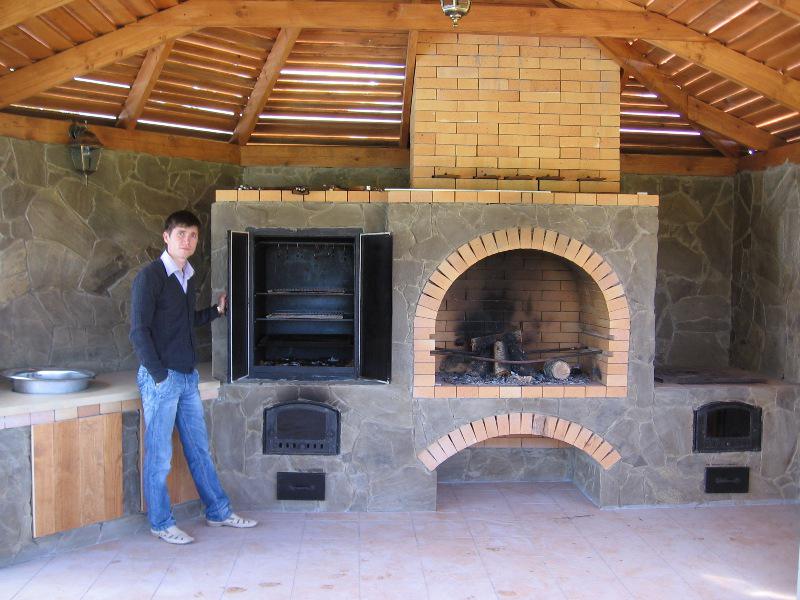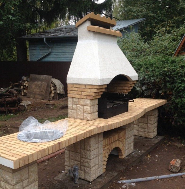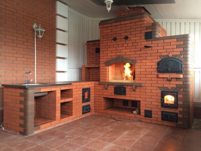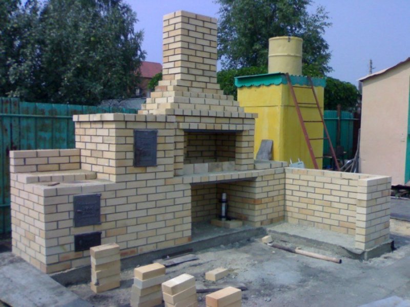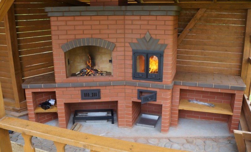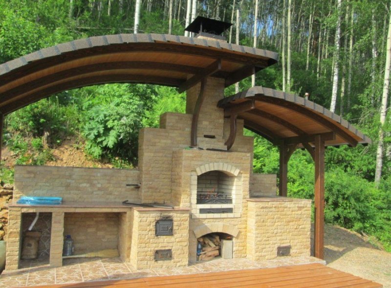 Это универсальное приспособление для жарки блюд с несколькими топливниками. Конструкция должна иметь прочное основание. В центральной части проектируется несколько зон для готовки. По краям следует разместить по одной большой столешнице. Печки можно будет использовать и для приготовления блюд на ровной поверхности. Центральная камера должна быть обустроена для размещения решеток, а традиционные русские печки лучше делать сбоку. Первый этап строительства — рытье котлована. Затем создается песчаная подушка. Она накрывается слоем щебня, вдвое-втрое больше песчаного. Так как объект будет большим, фундаменту нужно «оставить» 2—3 недели для полного застывания. Его необходимо время от времени поливать небольшим количеством воды. Основной этап — кладка кирпичей. Печки выделяются 4 столбиками или 3 стенками, кроме передней. Процесс возведения нескольких печек сложнее, чем обычной конструкции с одной жаровней и дополнительными секциями.