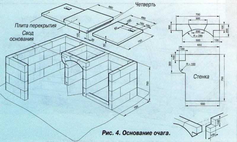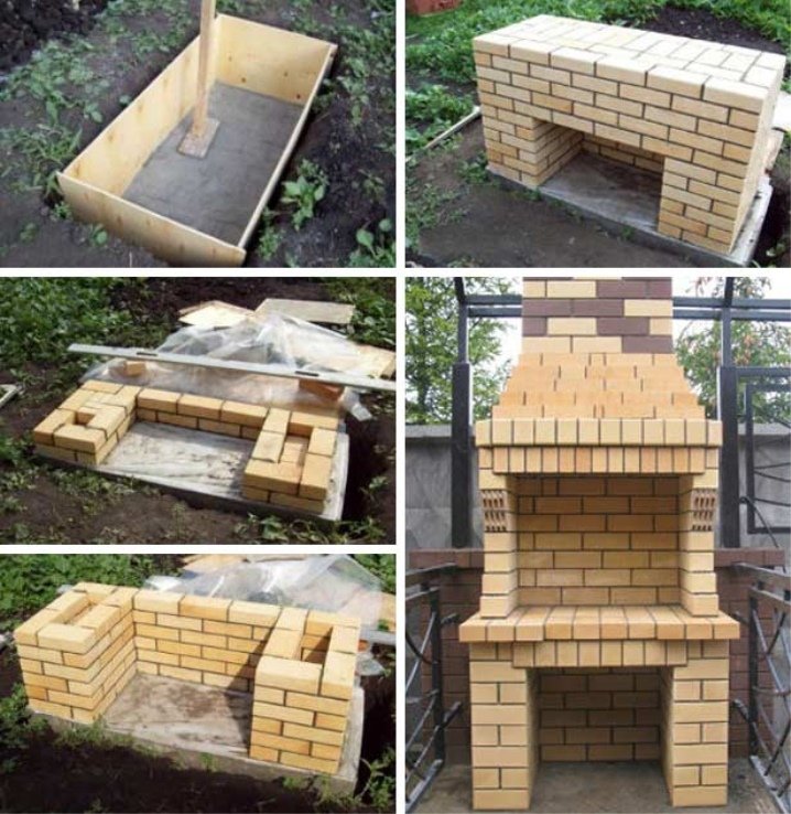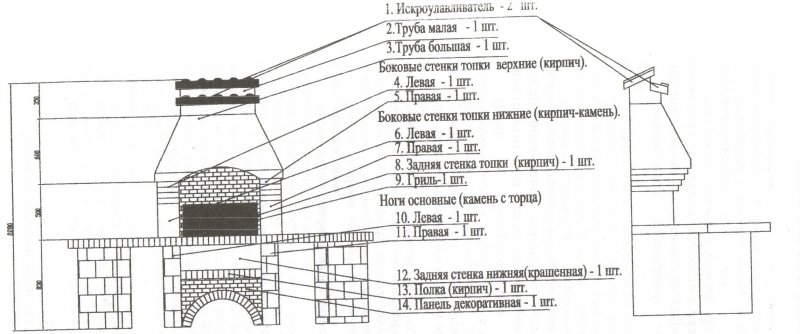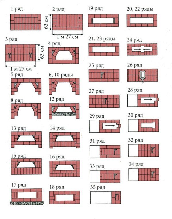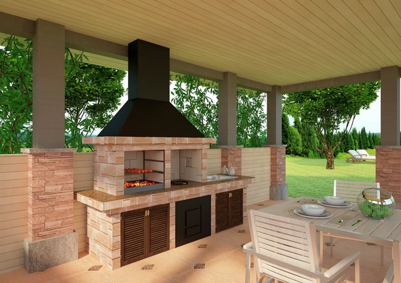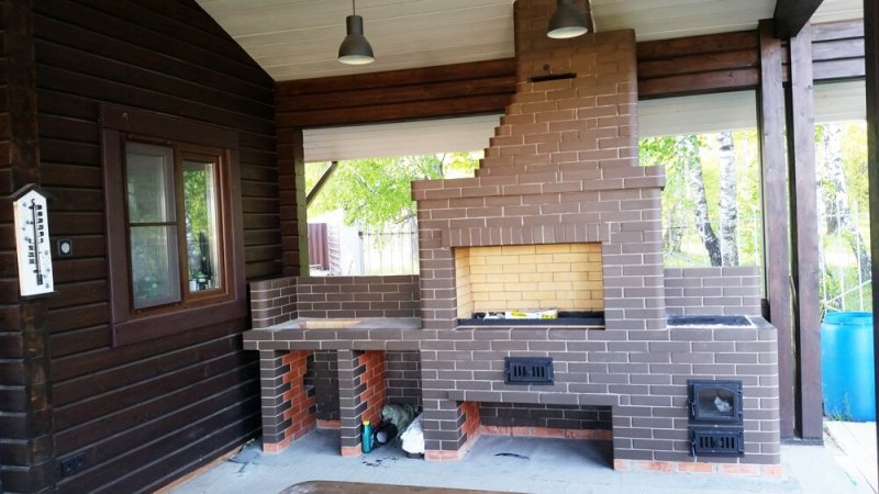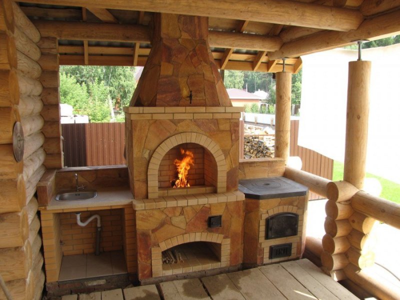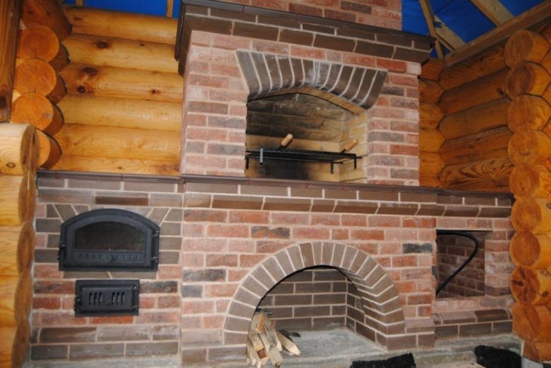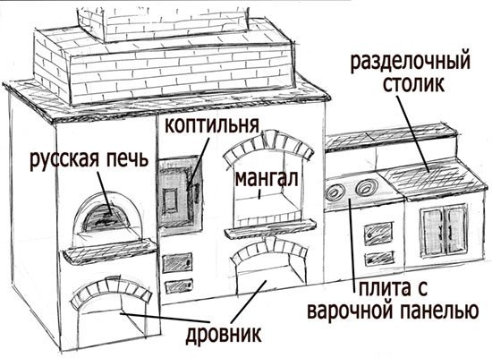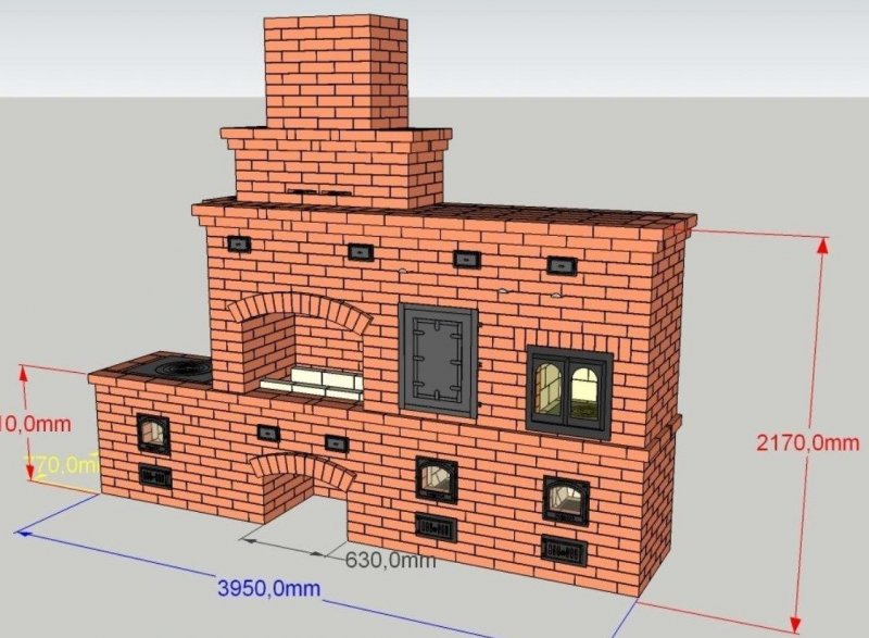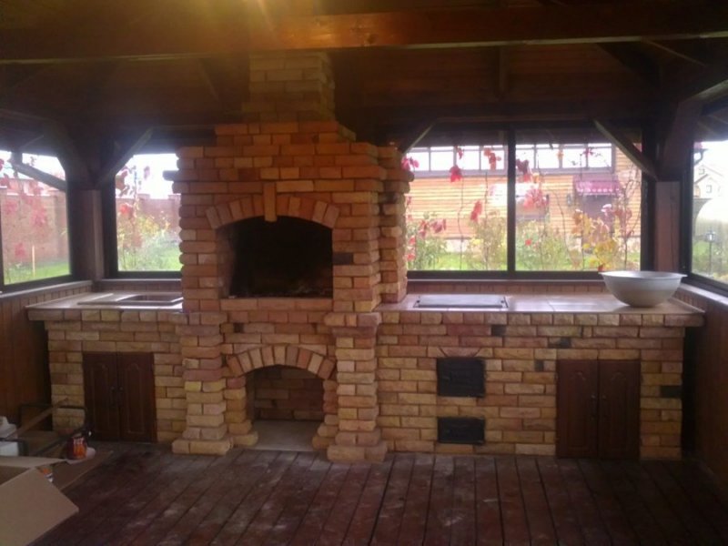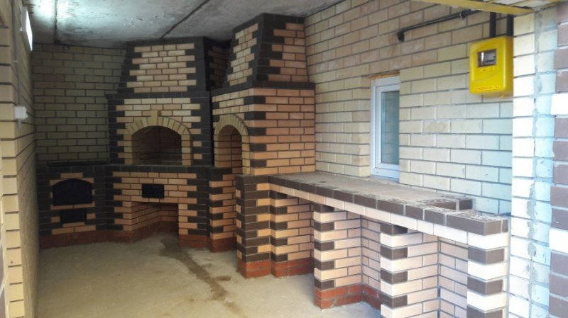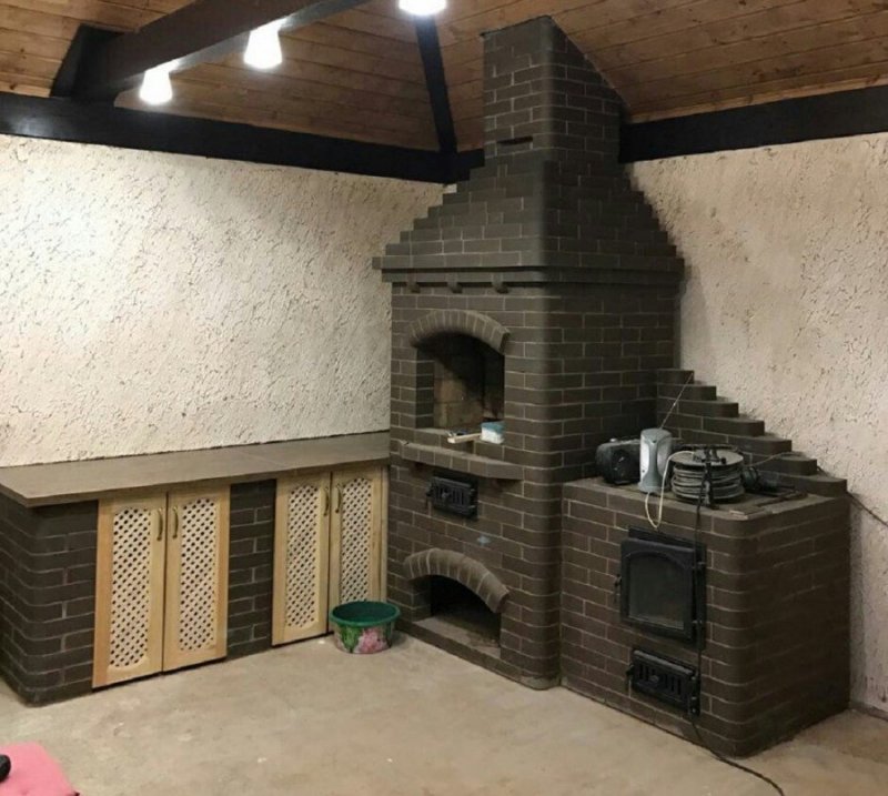Это универсальное приспособление для жарки блюд с несколькими топливниками. Конструкция должна иметь прочное основание. В центральной части проектируется несколько зон для готовки. По краям следует разместить по одной большой столешнице. Печки можно будет использовать и для приготовления блюд на ровной поверхности. Центральная камера должна быть обустроена для размещения решеток, а традиционные русские печки лучше делать сбоку. Первый этап строительства — рытье котлована. Затем создается песчаная подушка. Она накрывается слоем щебня, вдвое-втрое больше песчаного. Так как объект будет большим, фундаменту нужно «оставить» 2—3 недели для полного застывания. Его необходимо время от времени поливать небольшим количеством воды. Основной этап — кладка кирпичей. Печки выделяются 4 столбиками или 3 стенками, кроме передней. Процесс возведения нескольких печек сложнее, чем обычной конструкции с одной жаровней и дополнительными секциями.