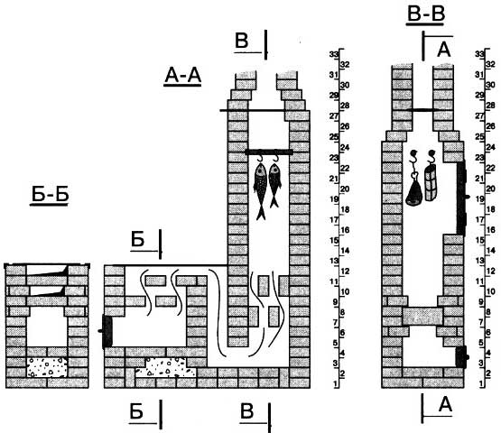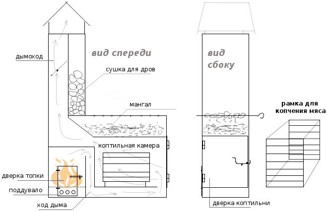 Для создания коптильни необходима крышка для удерживания дыма. Существует несколько способов ее изготовления. Есть задвигающиеся модели, съемные, откидные с одним элементом, а также состоящие из двух половин. Размер ножек может быть разным, этот параметр можно подбирать в зависимости от размера конструкции. Кирпичная коптильня имеет преимущество: есть возможность создать несколько камер и дымоходов. Предпочтительно создавать несколько коптилен в одной большой конструкции, чтобы потом не пришлось думать о создании еще одной стационарной постройки. Главными элементами кирпичного мангала с коптильней являются дымоход, камера горения и сам очаг с коптильной камерой. Отсек для копчения делают под мангалом, с выходом к дымоходу — в итоге часть дыма остается внизу. Одинарная конструкция имеет относительно небольшую ширину.