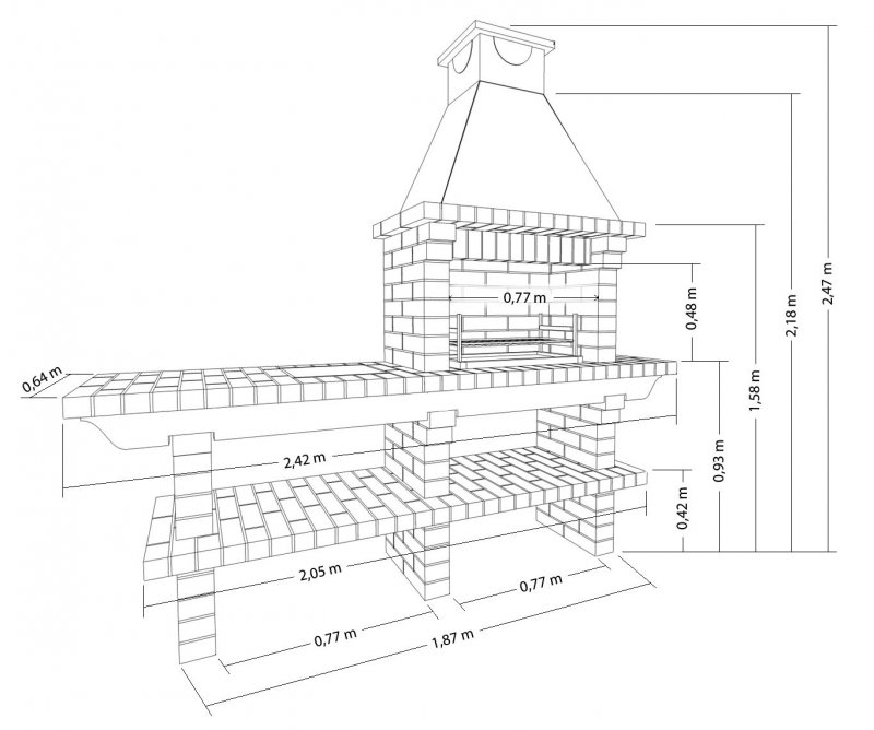 Высота мангала подбирается в зависимости от роста. Ориентироваться стоит на самого высокого человека в семье. Верх рабочей зоны в идеале на 1 метр выше уровня запястья опущенной руки. Ширину зоны готовки обычно делают не более 1 метра, так как в этом промежутке поместятся сетки для рыбы и мяса и около десятка шампуров. Оптимальный размер составляет примерно 170x90 см. Если хозяин предпочитает работу сидя, то конструкцию делают с высотой примерно 0,8—1,2 метра. Будут полезными специальные секции для хранения шампуров, поленьев, угля и других принадлежностей. Рекомендуется выделить удобное место для посуды. Идеальная комплектация предусматривает наличие места для подачи воздуха и золы. Уровень безопасности повысит решетка над зоной готовки. Мангал можно использовать в качестве гриля или барбекюшницы.