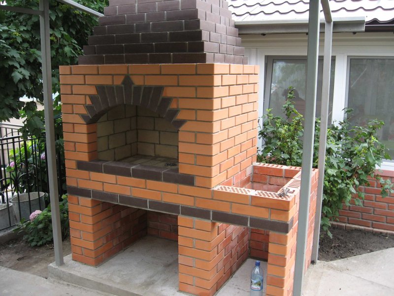 Рабочую зону лучше отделывать огнеупорным кирпичом. Если же постройка будет использоваться нечасто, то подойдет обычный красный. Наружную часть сооружения можно отделать облицовочным кирпичом — существует несколько разных вариантов по цвету и форме. Огнеупорный материал поможет сохранять тепло, а это пригодится для готовки на углях. При этом внешнюю часть конструкции можно выполнять из клинкерного кирпича. Иногда выбирают «состаренный» кирпич, тогда постройка будет выглядеть интереснее. Специальный печной или шамотный кирпич используют в самих жаровнях и в каминах, где огонь горит постоянно. Темный оттенок указывает на повышенную устойчивость к воздействию огня. Не стоит применять силикатный или керамический кирпич с пустотами. Чтобы не отягощать конструкцию, ее стенки выкладывают пустотелым клинкерным. Он стойкий к механическому воздействию и температурным перепадам.