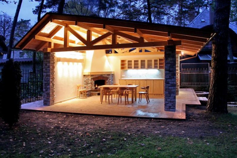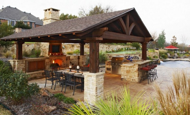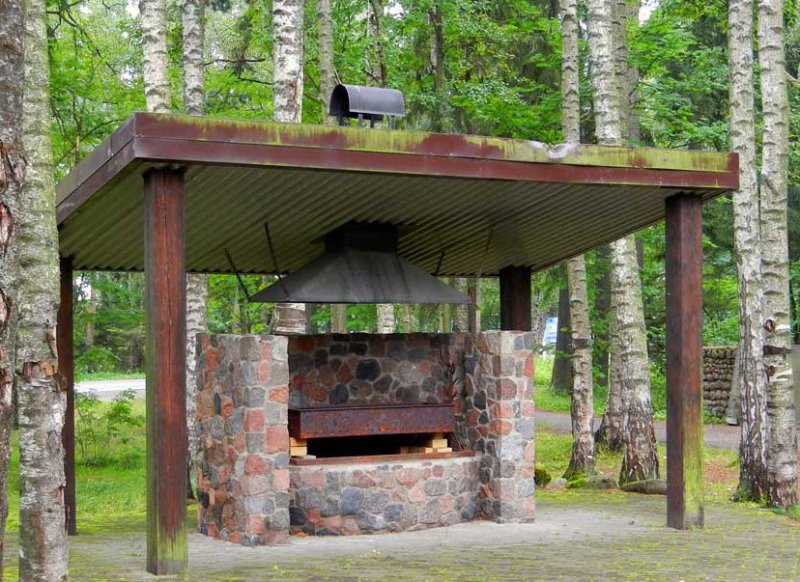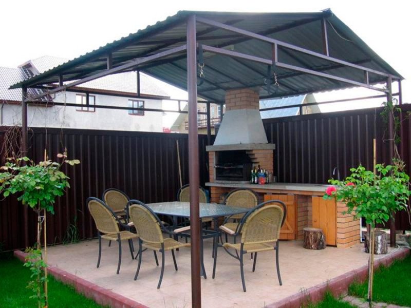 Над постройкой рекомендуется установить навес. Необходимо сразу определиться, будет он размещаться на большой площади или только над мангалом. Потребуется сделать минимум три опоры, а в идеале хотя бы шесть. В качестве материала используют металл или дерево. Под столбы формируется бетонное основание. Минимально допустимое расстояние между мангалом и деревянным столбом — 16 см. Кровля может выполняться из любого материала, которым отделывают крыши домов. Мангал хорошо впишется в общий ансамбль дачного участка, если навес над ним будет обустроен так же, как и кровля дома. Процесс установки покрытия на навес относительно быстрый и несложный. Цвет кровли подбирается под оттенок крыши жилого дома, цвет травы или оттенок кирпича, из которого построен мангал. Отделывать навес можно любым кровельным материалом вне зависимости от угла наклона.
